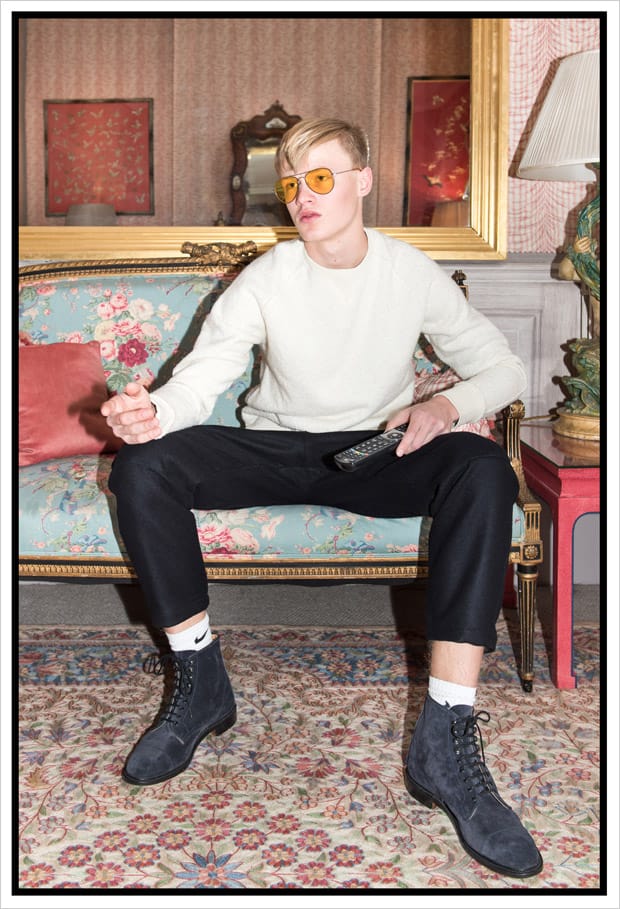 For the session models are wearing selected pieces from Acne Studios, All Saints, Elensa, Gizelle Renee, Dr Martens, Burberry, Kestin Hare, Hugo Boss, Oliver Spencer, Trickers, Levi’s, and Weston Earth.” – Malemodelscene.net