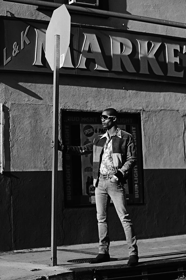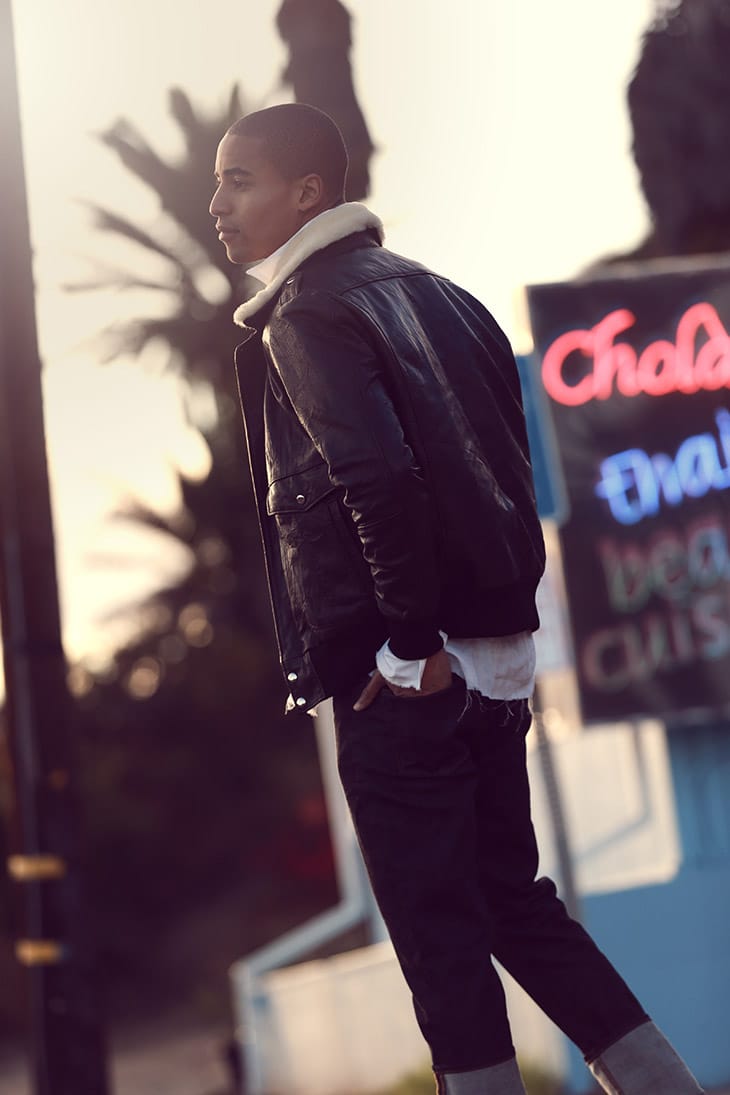 For the story Malik is wearing selected pieces from Diesel, Dunhill, Pele Che Coco, Greg Lauren, Levi, G Star Raw, Oakley, and Saint Laurent.” – Malemodelscene.net