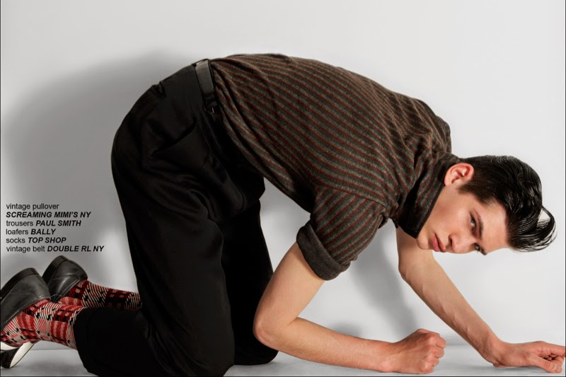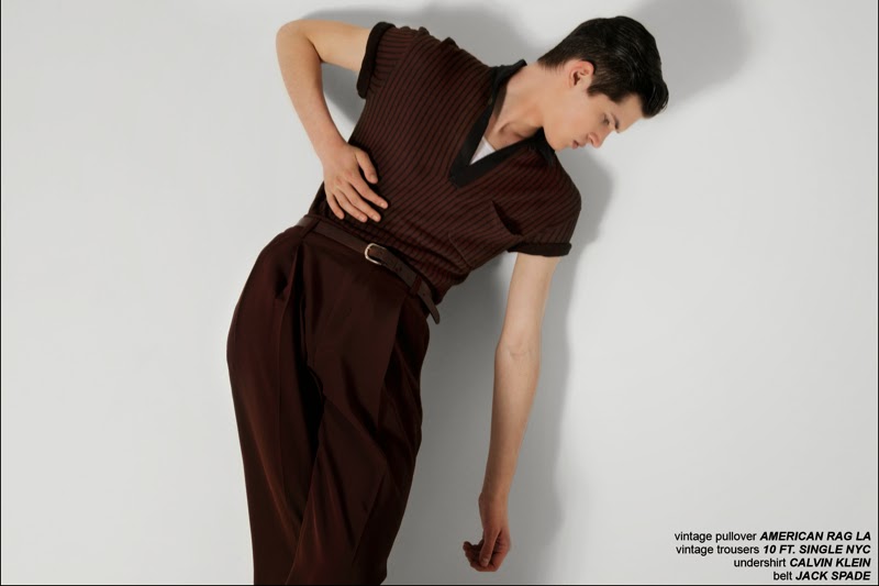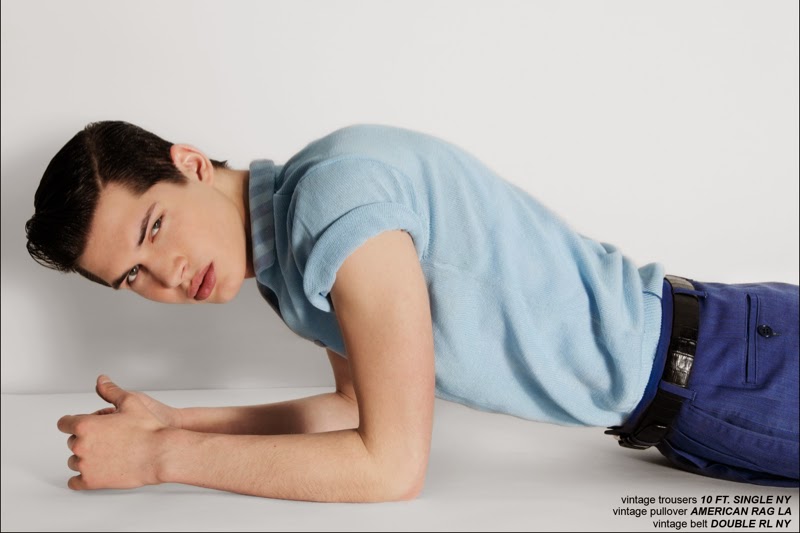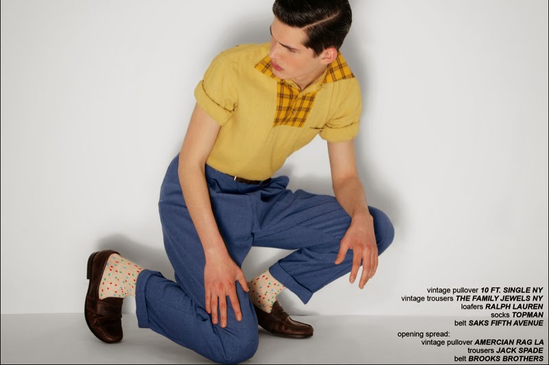 Pullover–Photographed by Alexander Thompson, Fusion model Ben Stift took part in a retro inspired photo shoot for Ponyboy, which was styled by Maria Ayala. Vintage knit pullovers with short-sleeved rolled sleeves dominate the editorial layout Pullover, from powder blues to mustard knits. Vintage pleated trousers, modern loafers, and argyle socks complete the retro inspired outfits revealed in the layout, and Stift’s youthful look and slicked hair fit perfectly with the overall retro and clean vibe.” – The Fashionisto
