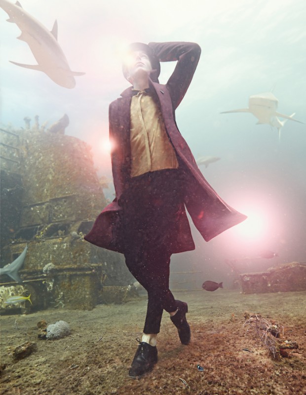 Fred who took the spotlight among the REAL LIFE sharks – not photo-shopped, took this season’s colourful coats underwater with styles from Canali, Paul Smith, Gucci, Berluti, Casely-Hayford, Alexander McQueen, Bally and Versace.