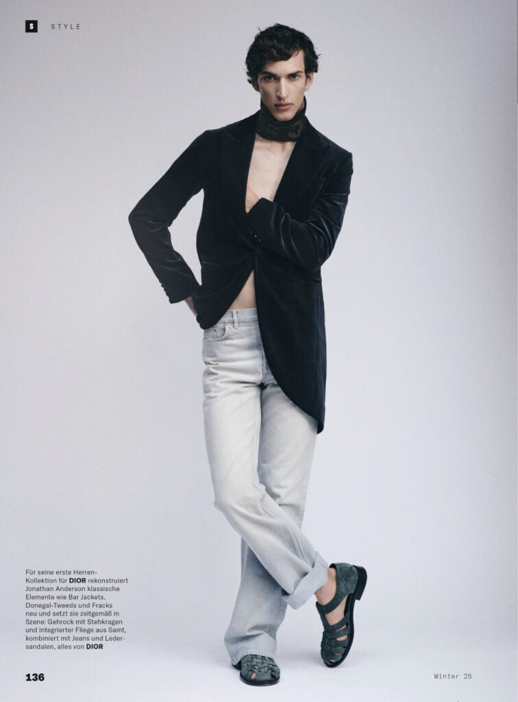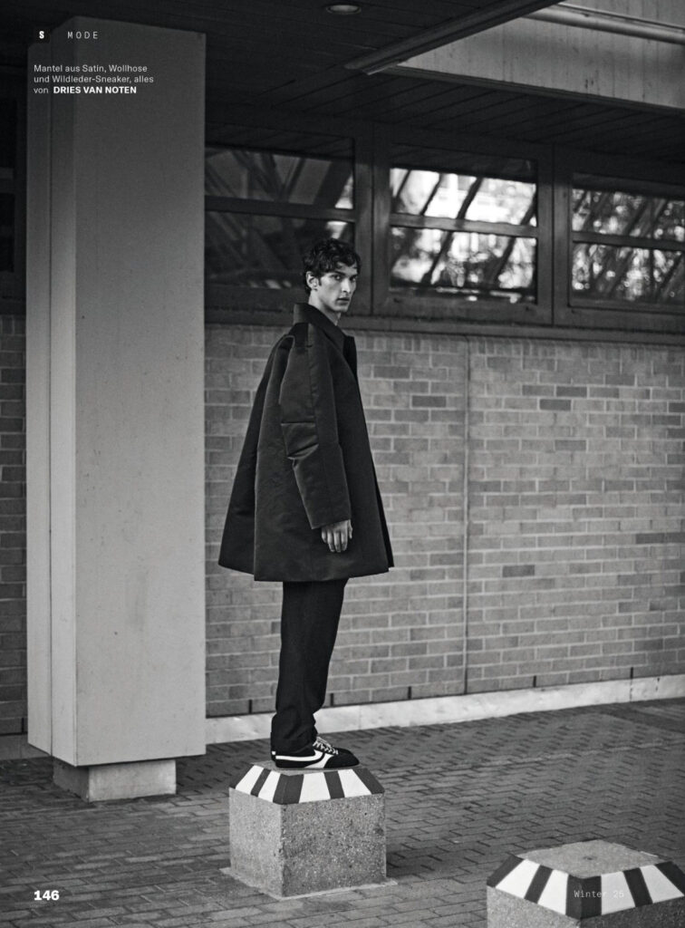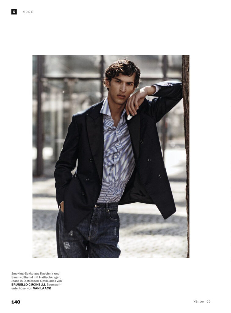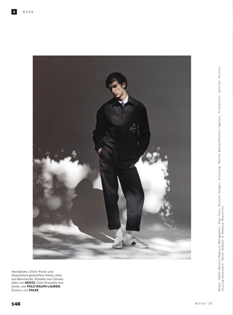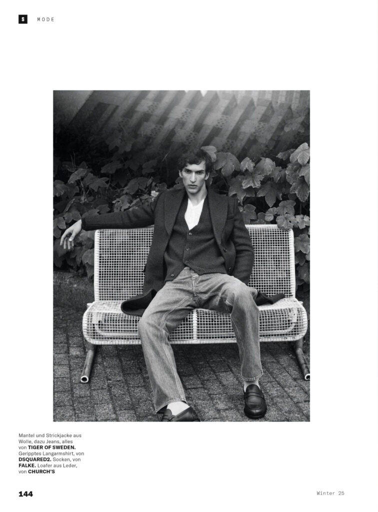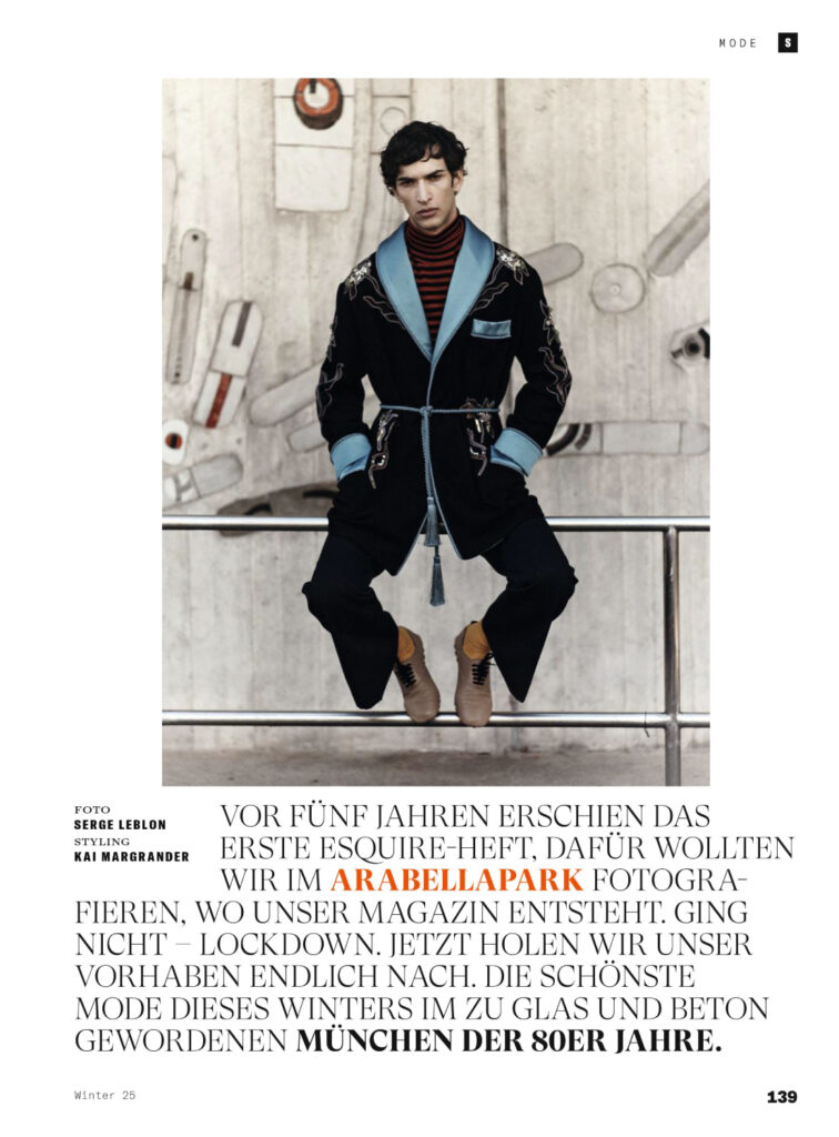 Mašović, part of the new generation of European talent, brings a contemplative edge to Margrander’s editorial concept. Leblon’s lens captures natural light and textured urban backdrops, aligning with Esquire Germany’s tradition of blending high fashion with cultural storytelling. The spread positions Mašović as both a rising face and a voice of modern menswear.