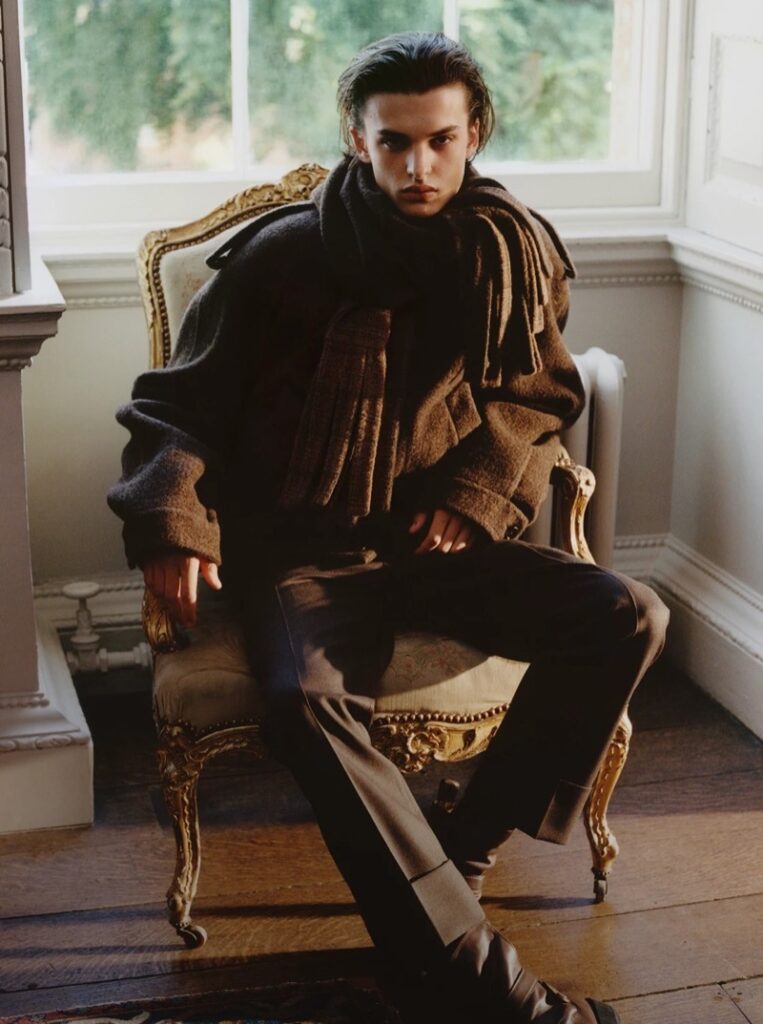 The visuals are stitched in tweed, velvet, and jacquard trench coats, with silhouettes that channel bohemian aristocracy and weather-worn luxury. Think velvet suits at breakfast and fisherman sweaters layered over check shirts—Burberry’s signatures reimagined with a twist.