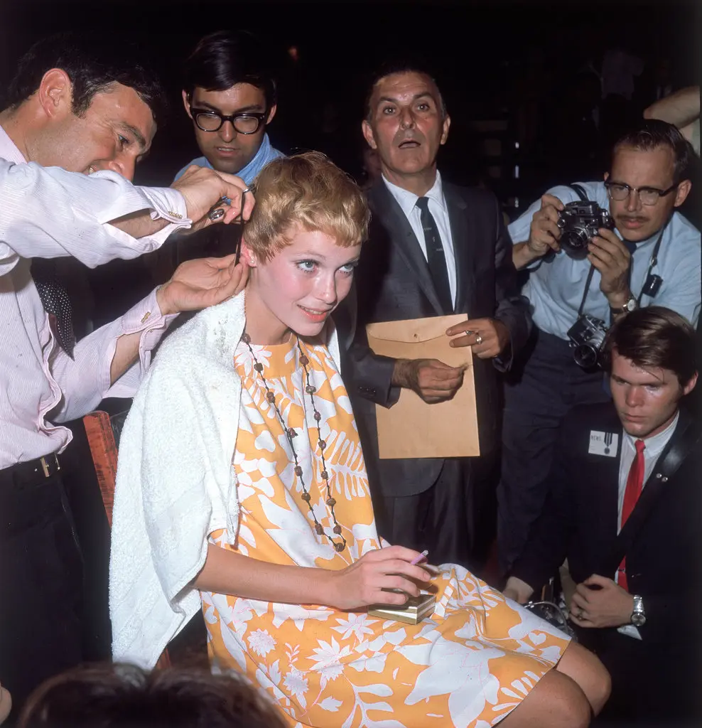 Vidal Sassoon styling Mia Farrow’s pixie cut during Rosemary’s Baby era