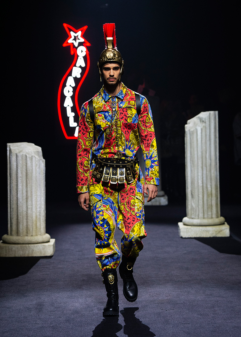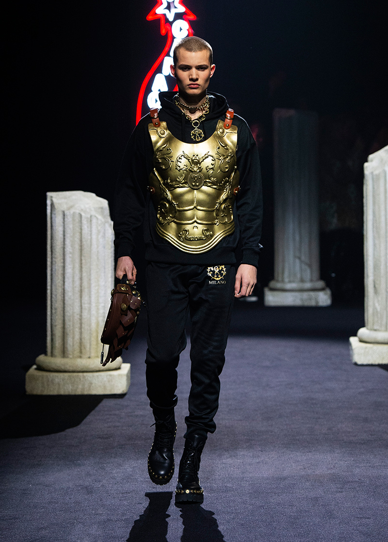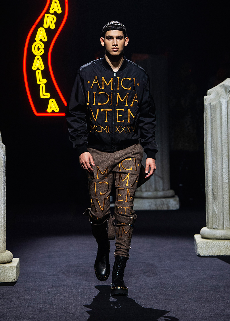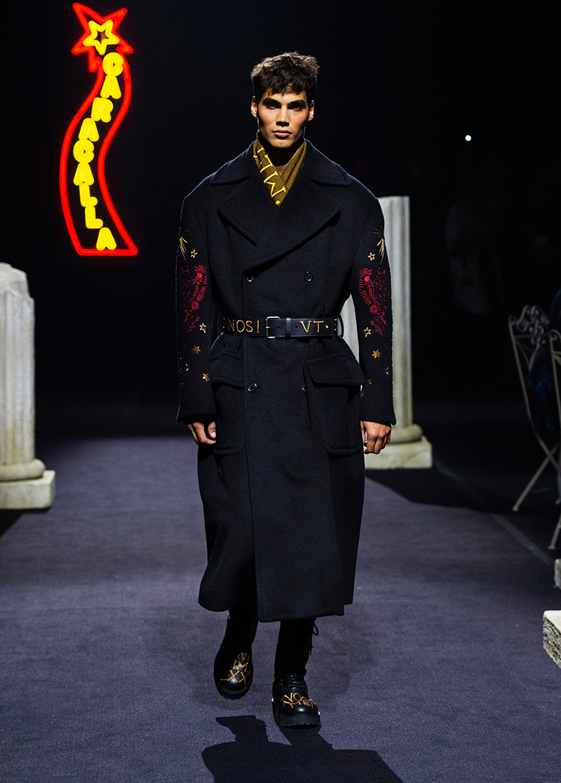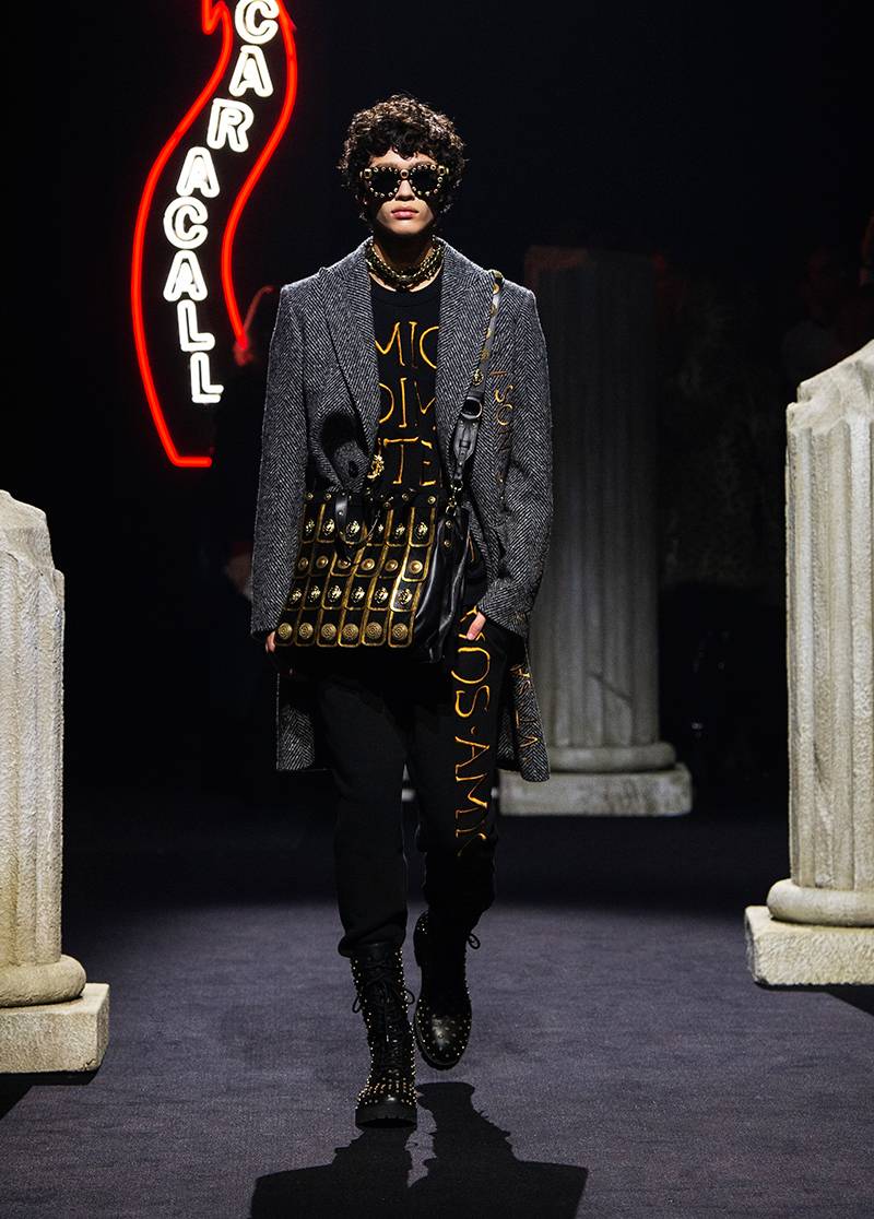 The inspiration demanded no other location but the Cinecittà studios on the outskirts of Rome, where everything – the enormous head of La Venusia created by Giantito Burchiellaro for Fellini’s Casanova, the Studio 5 and an exhibition itinerary at the Sala Federico Fellini which hosts some of the original costume designs from La Dolce Vita, Satyricon and Casanova – holds the magnitude of the Italian Maestro of the seventh art. With a career spanning 40 years of critically-acclaimed works and two Oscars for Best Foreign Language Film in 1956 and 1957 (La Strada and Nights of Cabiria), the film director’s dedication to social satire has a lot in common with the artistic invective of Moschino. In a mix of gladiator helmets and breastplates, jackets with pleated sashes and big bows dangling on the back, military coats and studded trousers, the American designer didn’t give a banal rendition of his rich source of inspiration, but he succeeded in creating on his own ‘terms’ a collection well-built and terrifically executed.” – FY Magazine.es