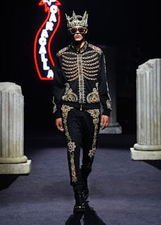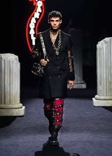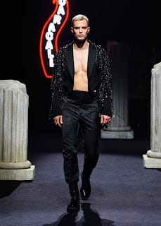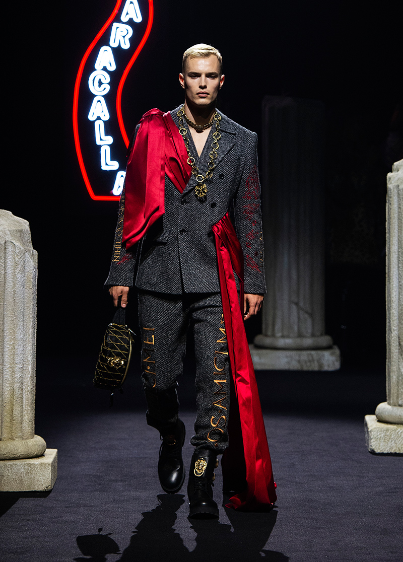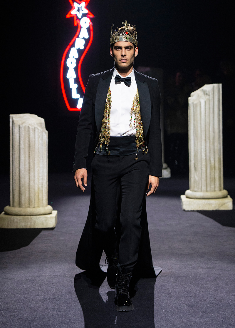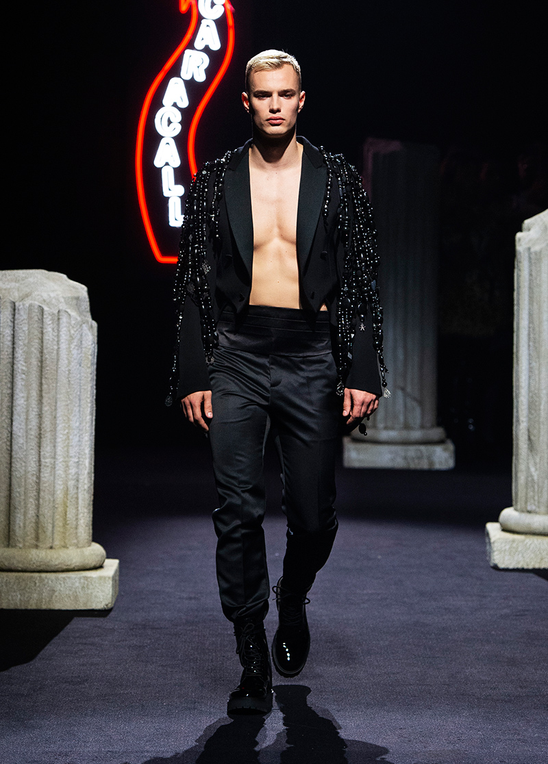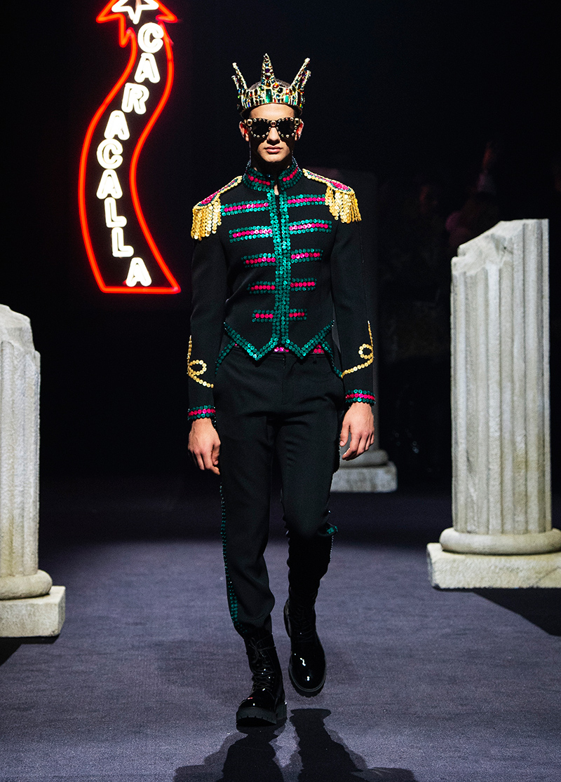 The inspiration demanded no other location but the Cinecittà studios on the outskirts of Rome, where everything – the enormous head of La Venusia created by Giantito Burchiellaro for Fellini’s Casanova, the Studio 5 and an exhibition itinerary at the Sala Federico Fellini which hosts some of the original costume designs from La Dolce Vita, Satyricon and Casanova – holds the magnitude of the Italian Maestro of the seventh art. With a career spanning 40 years of critically-acclaimed works and two Oscars for Best Foreign Language Film in 1956 and 1957 (La Strada and Nights of Cabiria), the film director’s dedication to social satire has a lot in common with the artistic invective of Moschino. In a mix of gladiator helmets and breastplates, jackets with pleated sashes and big bows dangling on the back, military coats and studded trousers, the American designer didn’t give a banal rendition of his rich source of inspiration, but he succeeded in creating on his own ‘terms’ a collection well-built and terrifically executed.” – FY Magazine.es