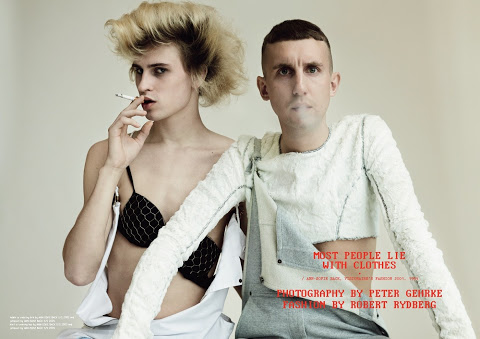 Karl Grahn and Adam Pettersson are photographed by Peter Gehrke and styled by Robert Rydberg in the story ‘Most People Lie With Clothes’ for the latest issue of Contributor, with hair by Ali Pirzadeh and makeup by Anya De Tobon. Courtesy of – Homotography
