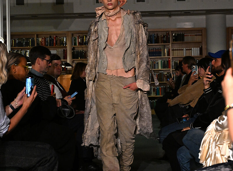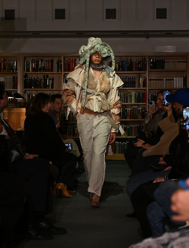 Titled “The Last Pangolin on Earth,” the collection drew inspiration from endangered species and the fading textures of a planet under siege. Carzana, a vegan designer known for his deeply personal presentations, used seaweed-based dyes and mordant techniques to create garments that appeared weathered by time and sandstorms. The result: silhouettes that felt both supernatural and grounded, echoing the genius of Mother Earth and the fragility of human impact.