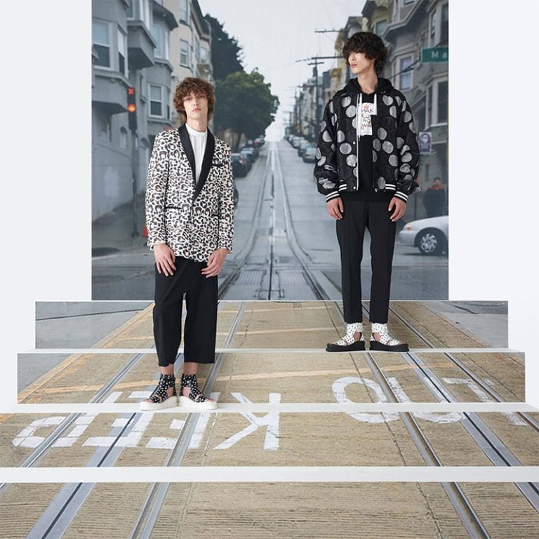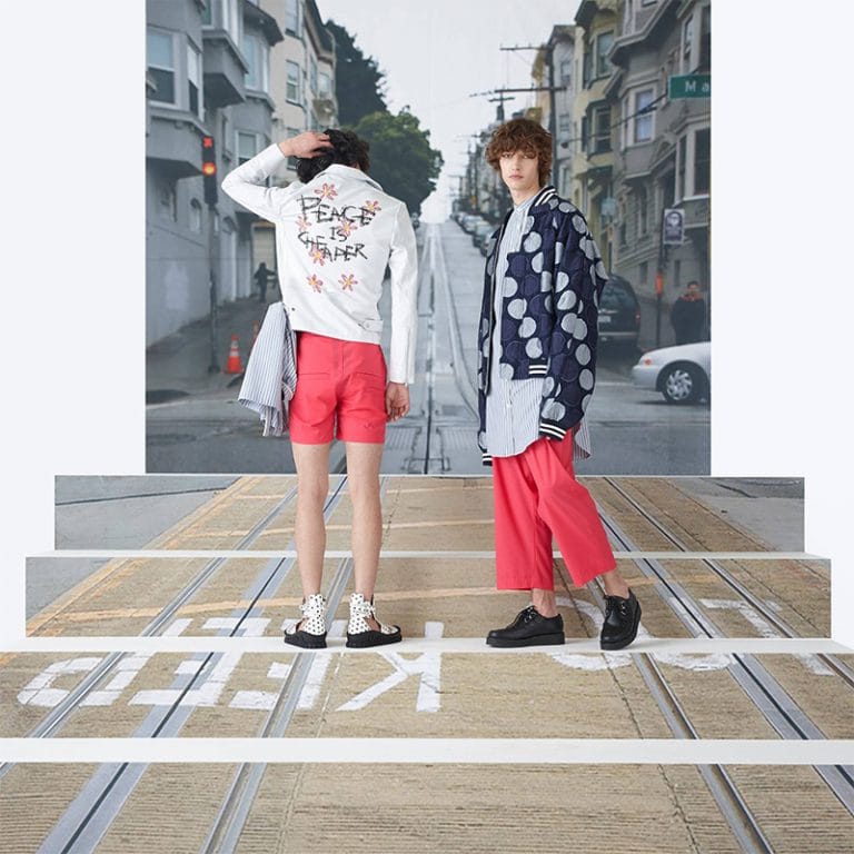 Throughout the Collection, fascinating design elements that symbolize San Francisco are presented. Slogans inspired by hippy culture such as “Make Love Not War” and “Peace Is Cheaper” are wittily delivered, and the Cupid’s Span details representing an outdoor sculpture in San Francisco’s Rincon Park are embroidered in blazers, rider jackets, and shirts to send out the message of love and peace.