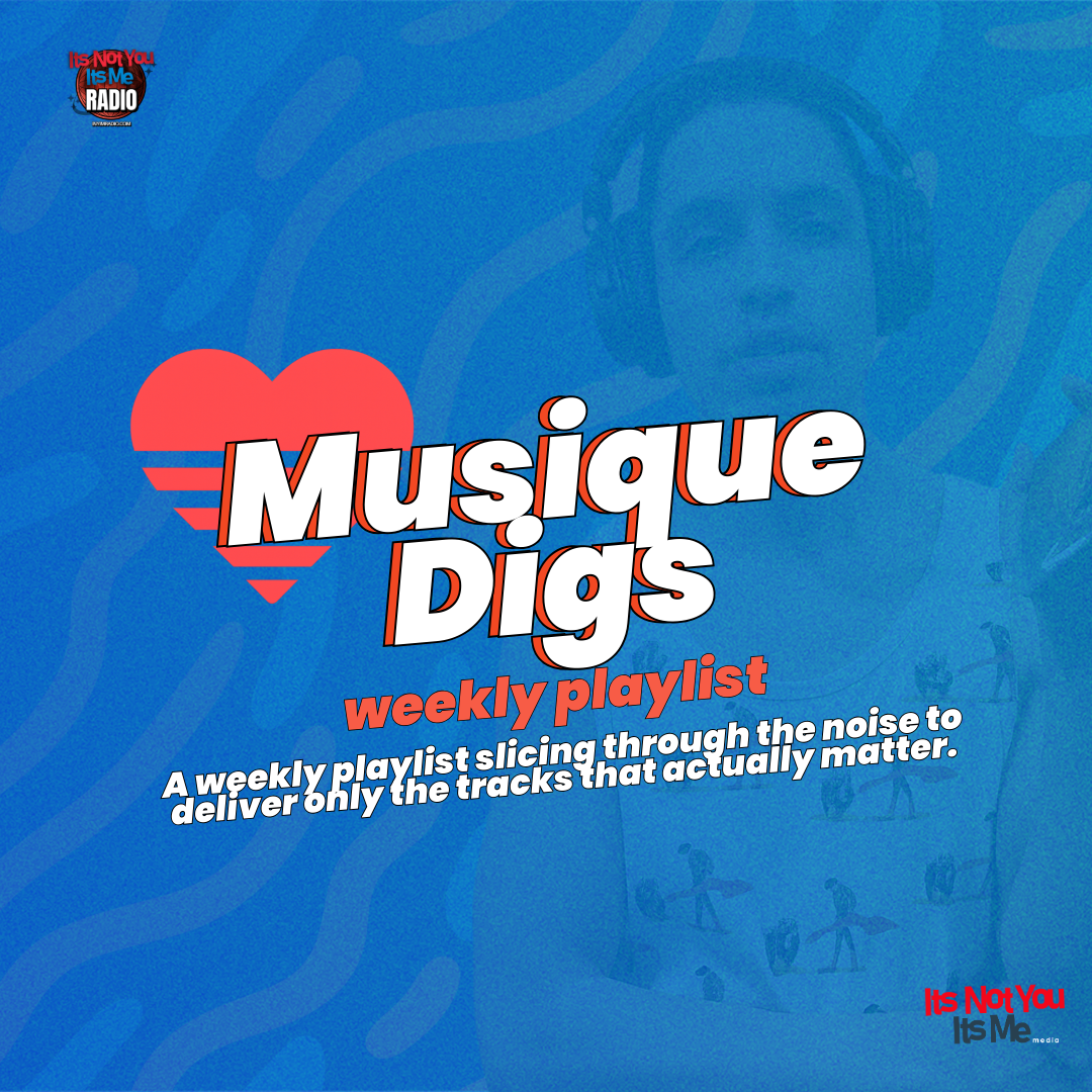 Musique Digs Weekly Playlist graphic with white and orange headline text on a textured blue background, featuring It’s Not You It’s Me Radio and It’s Not You It’s Me Media logos. Musique Digs Weekly Playlist graphic with white and orange headline text on a textured blue background, featuring It’s Not You It’s Me Radio and It’s Not You It’s Me Media logos.