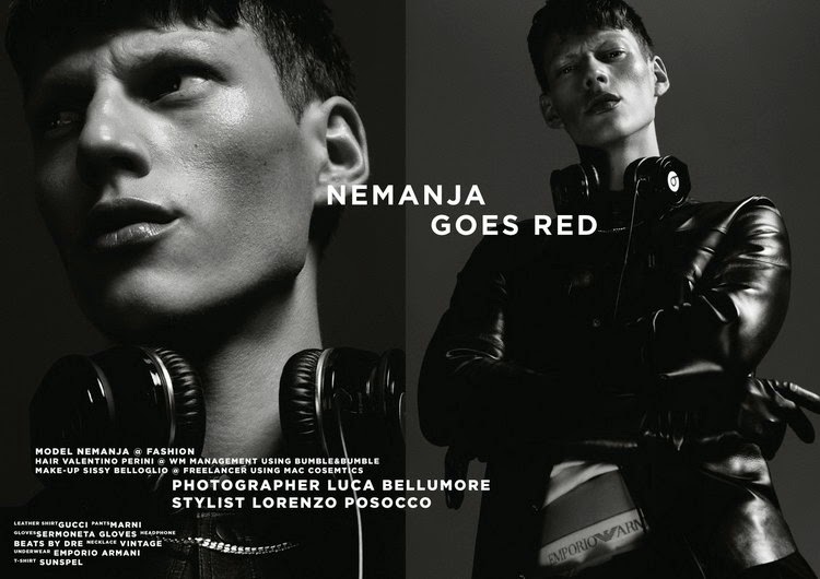 “Nemanja Goes Red–Photographer Luca Bellumore captures a different side of model Nemanja Maksic, shooting the June cover story of RedMilk magazine. Embracing a confident and sporty persona, Nemanja gets a wardrobe update courtesy of stylist Lorenzo Posocco. Mixing sporty labels such as Adidas with luxury brands that include Marni and Hermes, the stylish results are magical.” – The Fashionisto