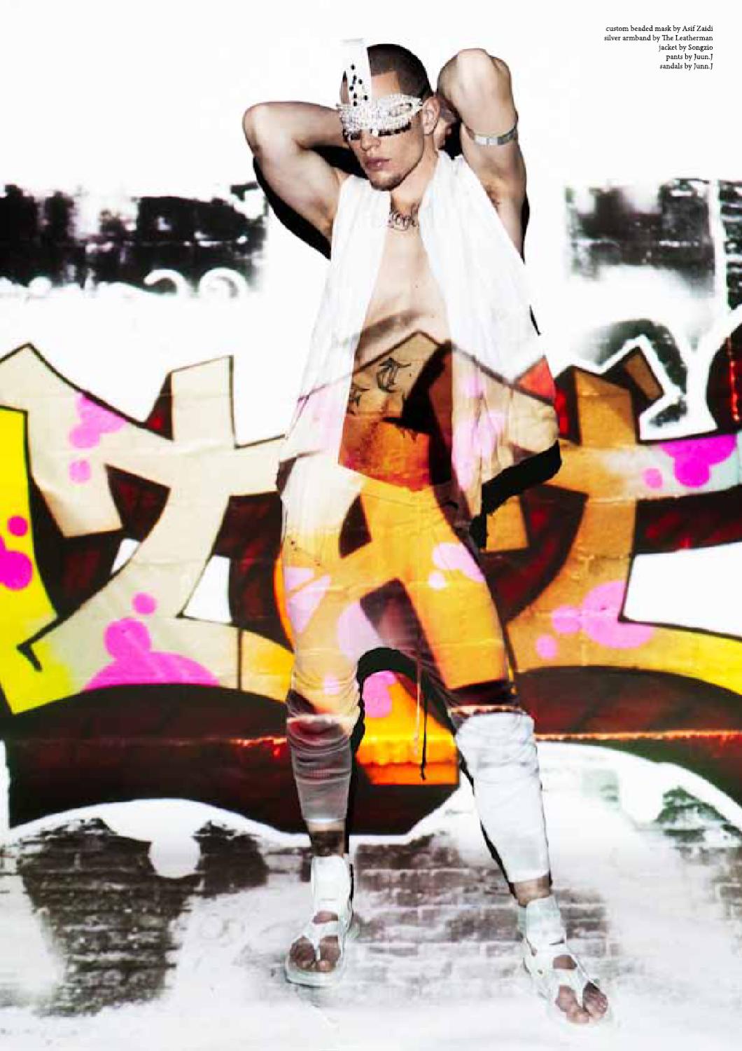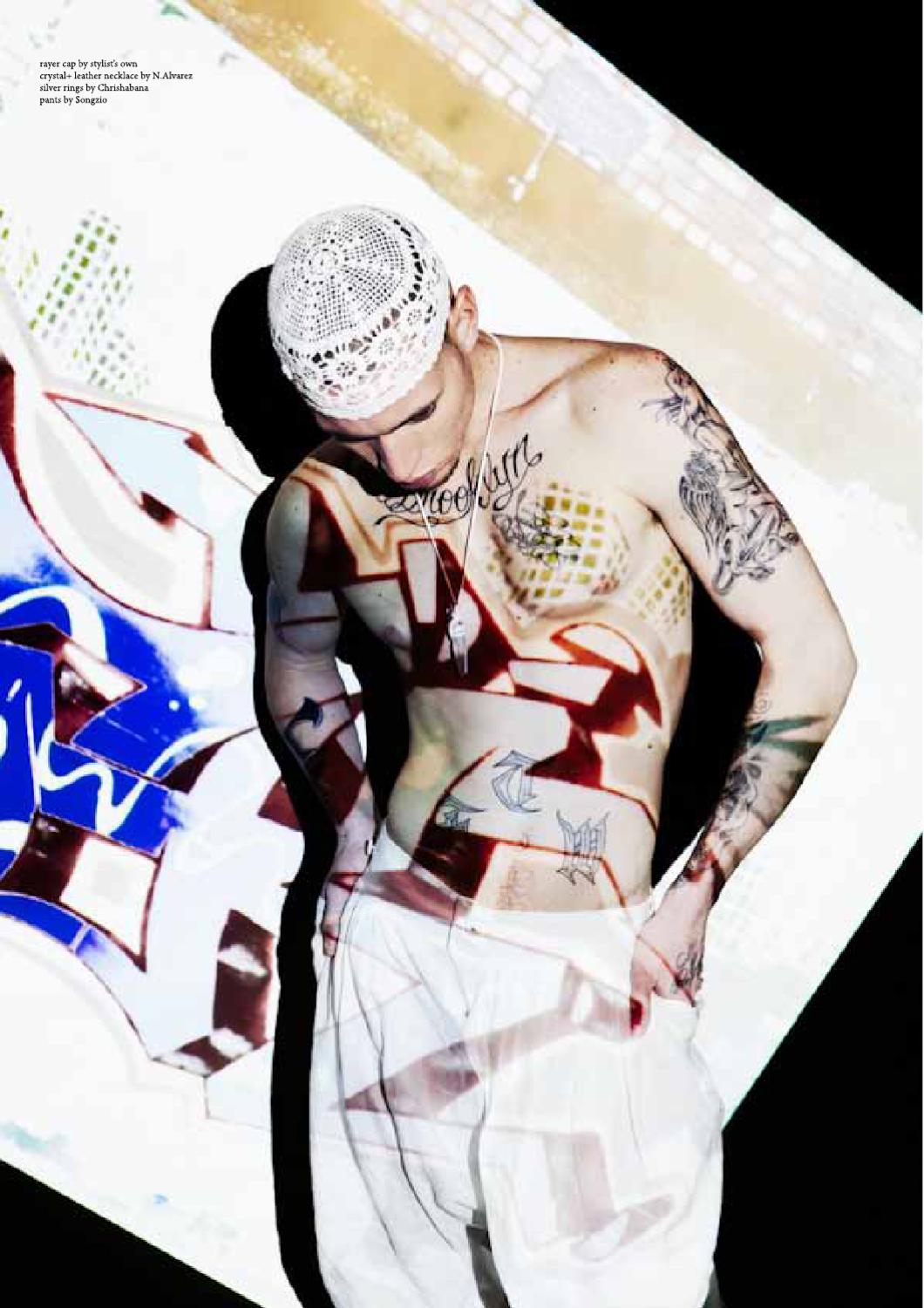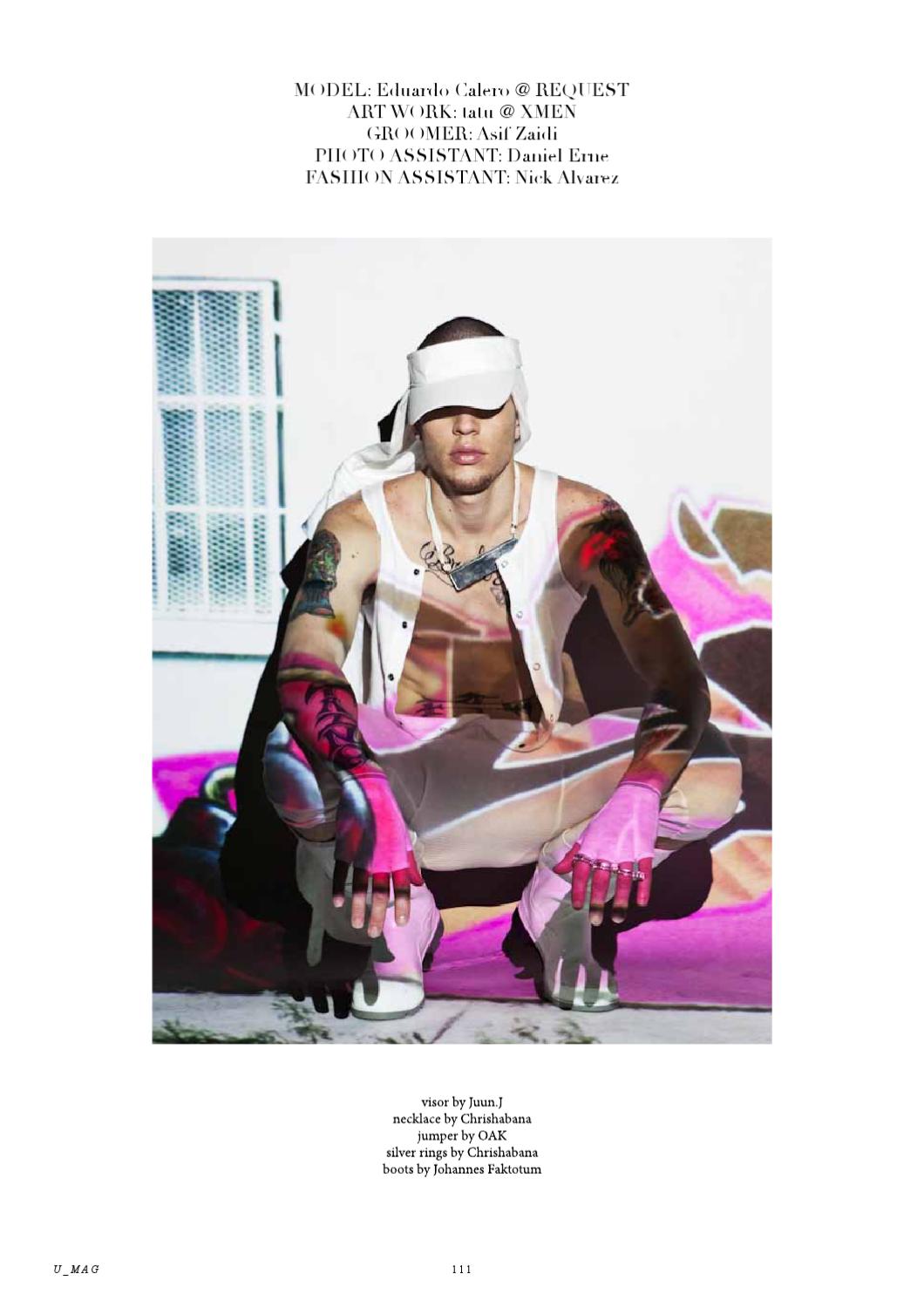 Riccardo Tisci muse Eduardo Calero is shot by Caius Christoe and styled by Fredo in U+Mag’s Boys issue. Calero’s hypermasculinity and strong facial features are one of the reasons that he has appeared in the campaigns for Givenchy, melding Tisci’s aesthetic and creating a vision that’s palpable and coherent. Eduardo’s talents are put to good use in this graffiti infused editorial featuring pieces from JuunJ & Songzio. Courtesy of – hommemodel.blogspot.com