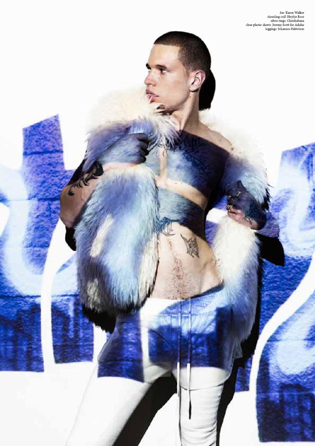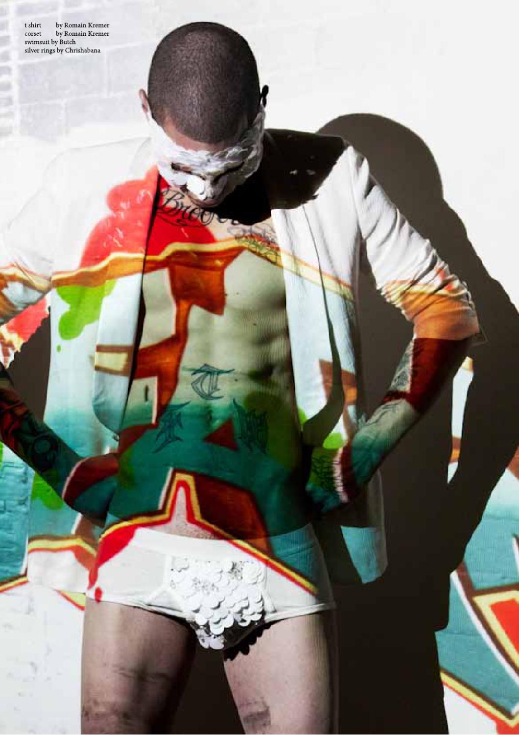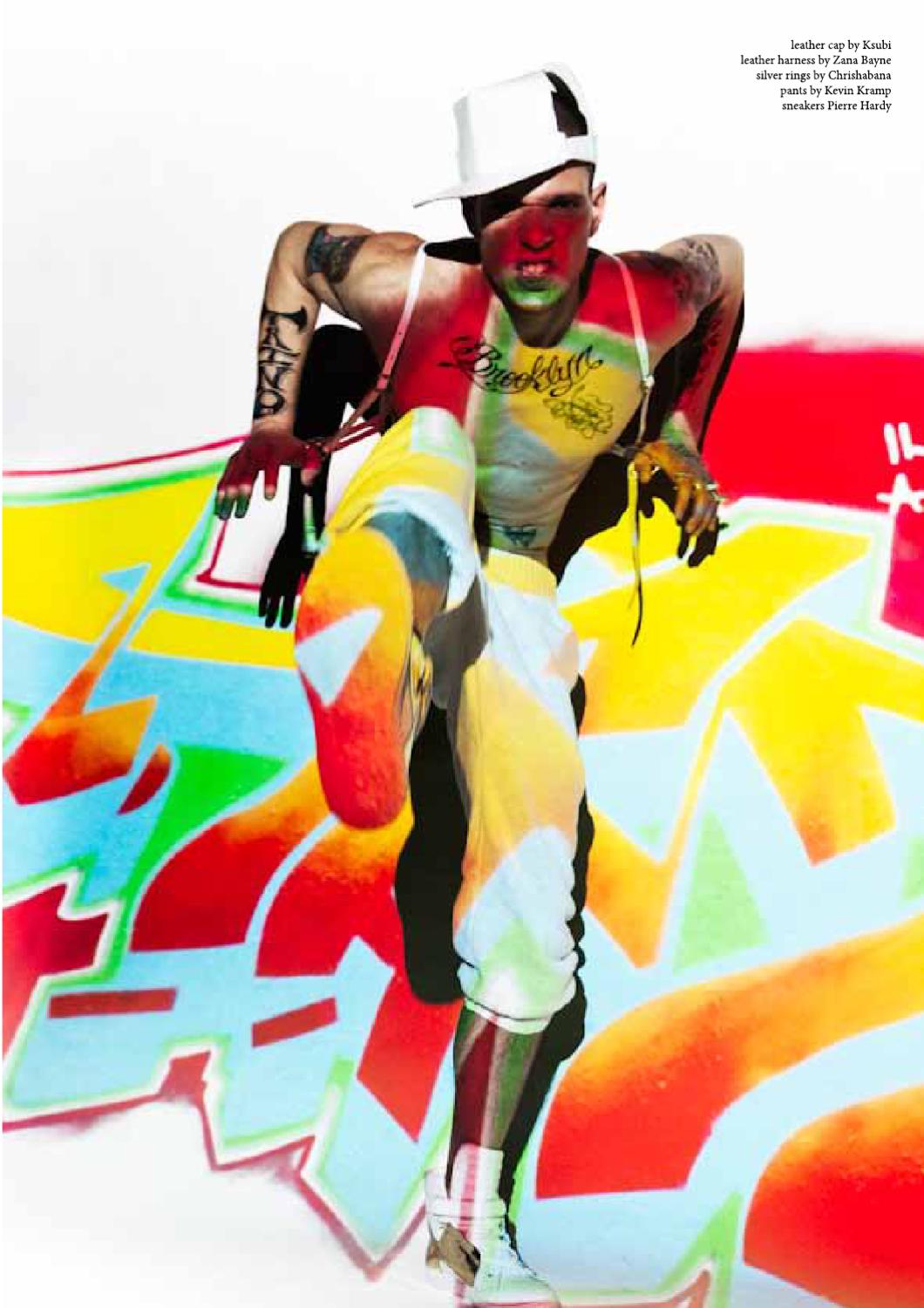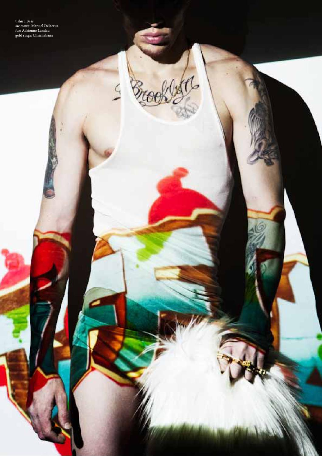 Riccardo Tisci muse Eduardo Calero is shot by Caius Christoe and styled by Fredo in U+Mag’s Boys issue. Calero’s hypermasculinity and strong facial features are one of the reasons that he has appeared in the campaigns for Givenchy, melding Tisci’s aesthetic and creating a vision that’s palpable and coherent. Eduardo’s talents are put to good use in this graffiti infused editorial featuring pieces from JuunJ & Songzio. Courtesy of – hommemodel.blogspot.com
