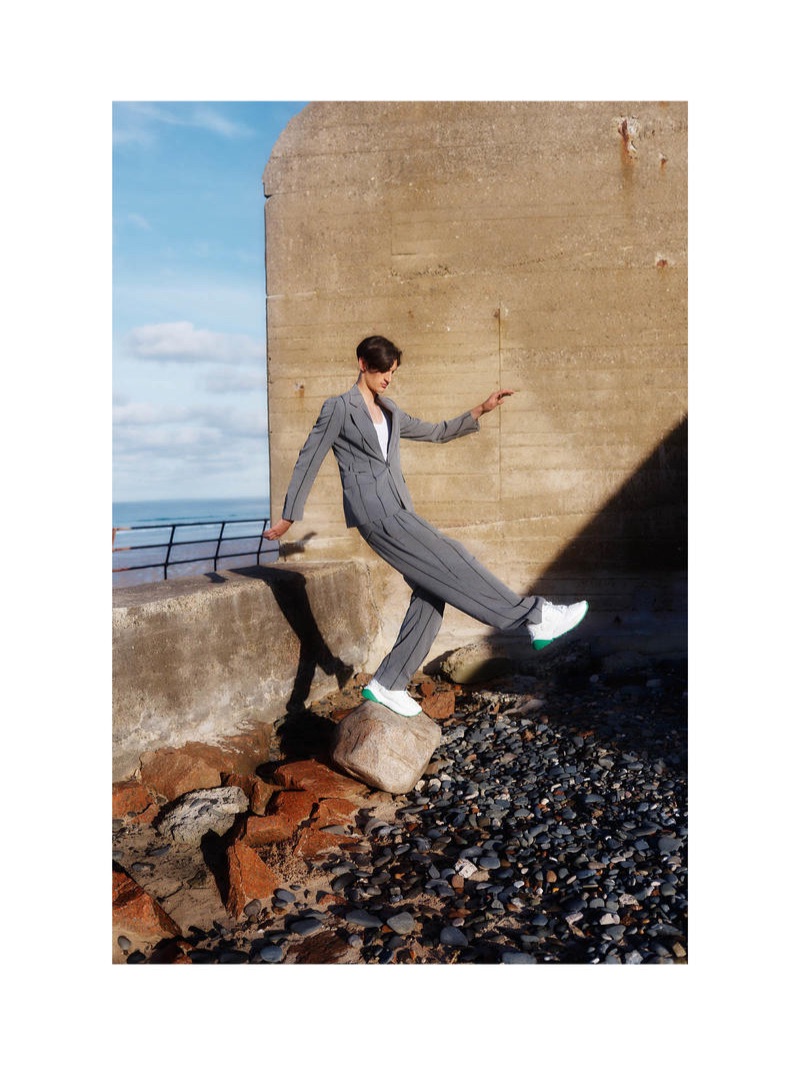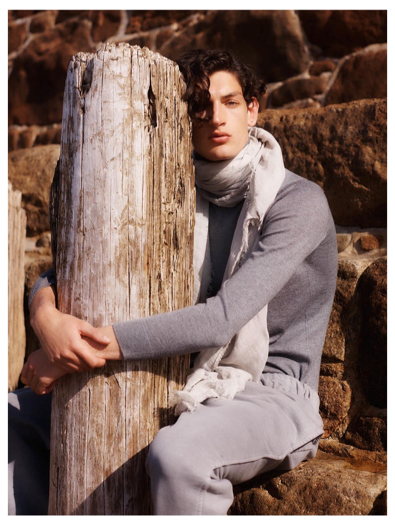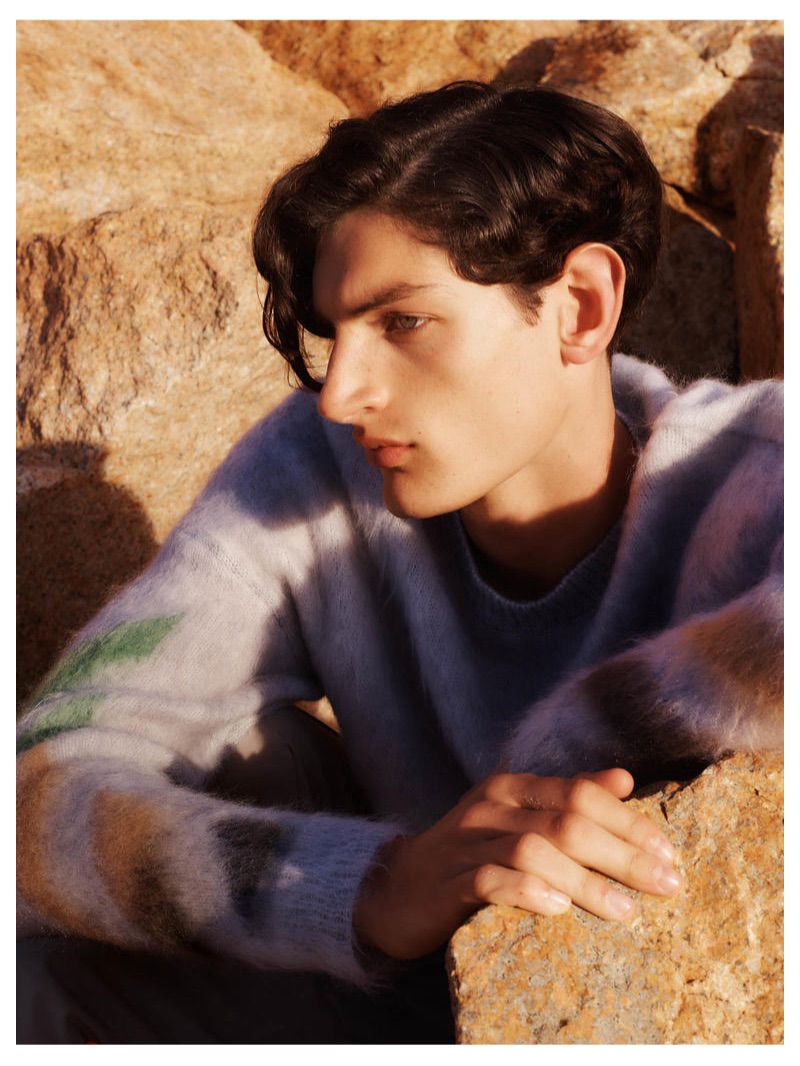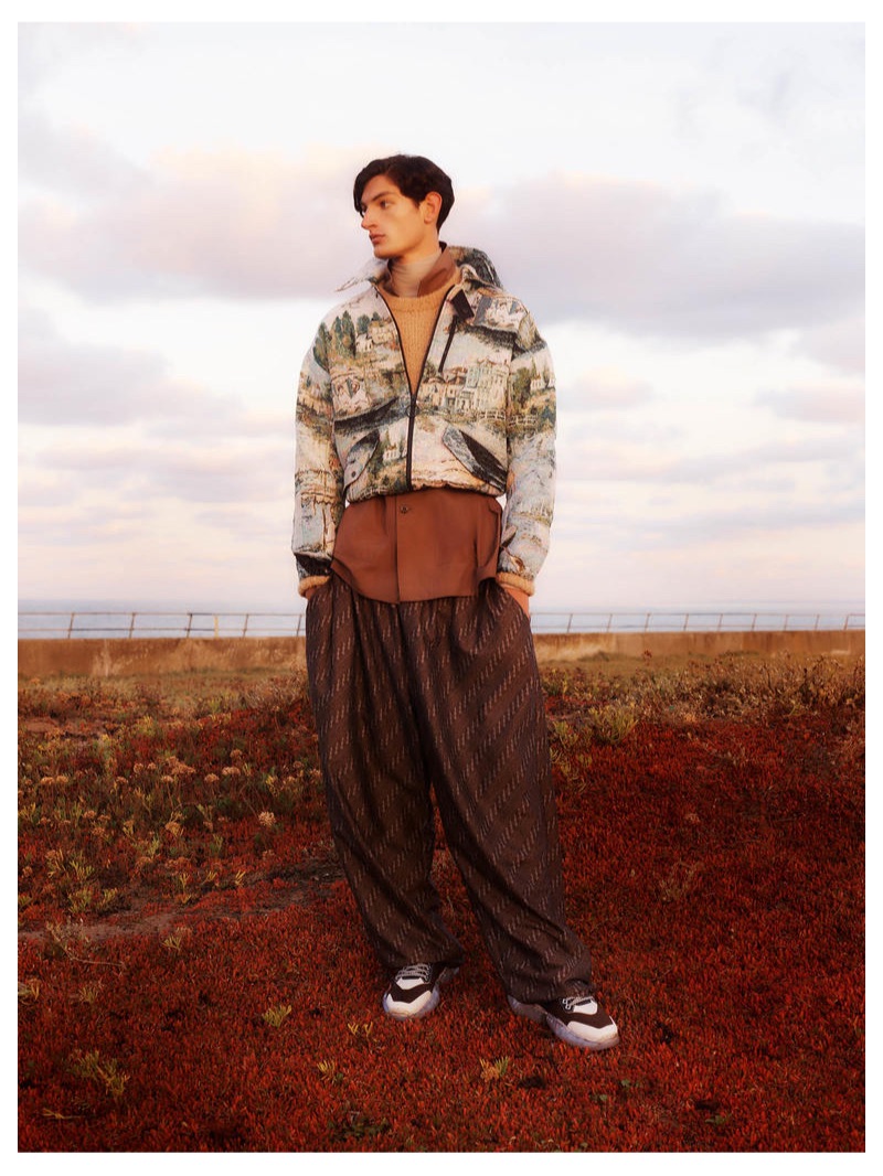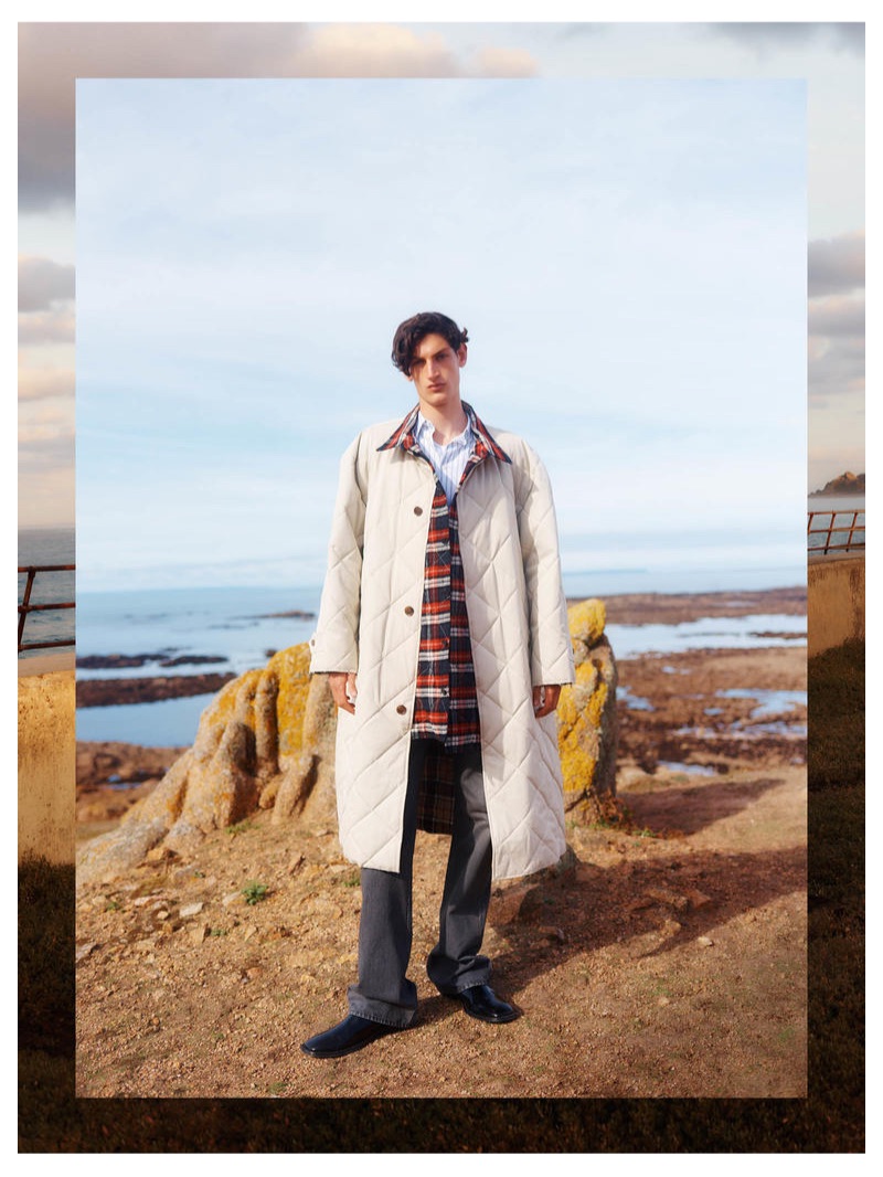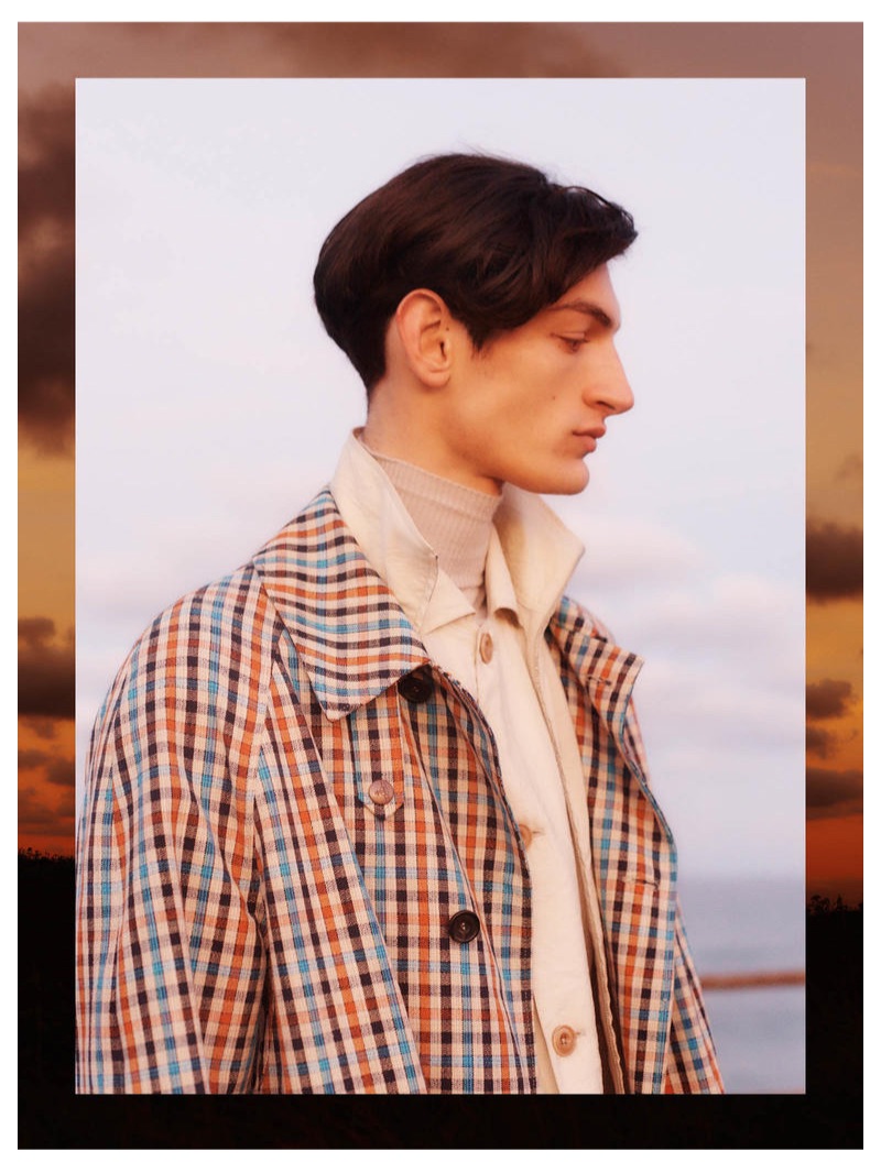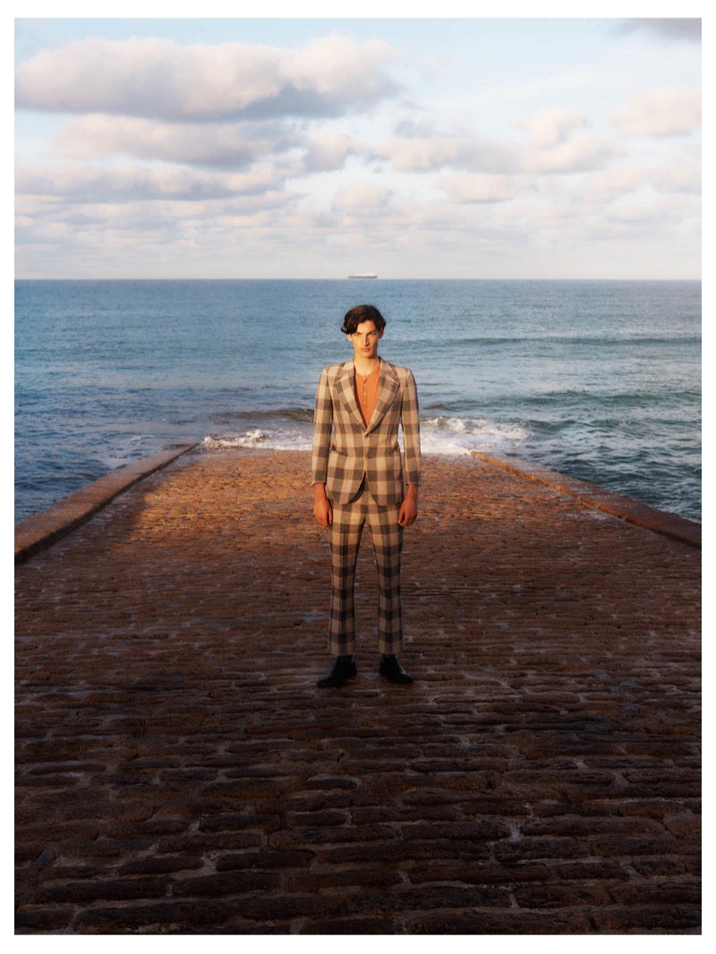 “Aaron Shandel embraces tailored and oversized proportions for a fashion editorial. Clark Franklyn photographs him for Harrods magazine. Pictured outdoors, Aaron takes to the beach in a variety of covetable brands. Stylist Becky Palmano curates a selection that includes labels like Lemaire, Vivienne Westwood, and Gucci. The lineup features transitional styles with coats, knitwear, tailoring, and more.” – TheFashionisto.com