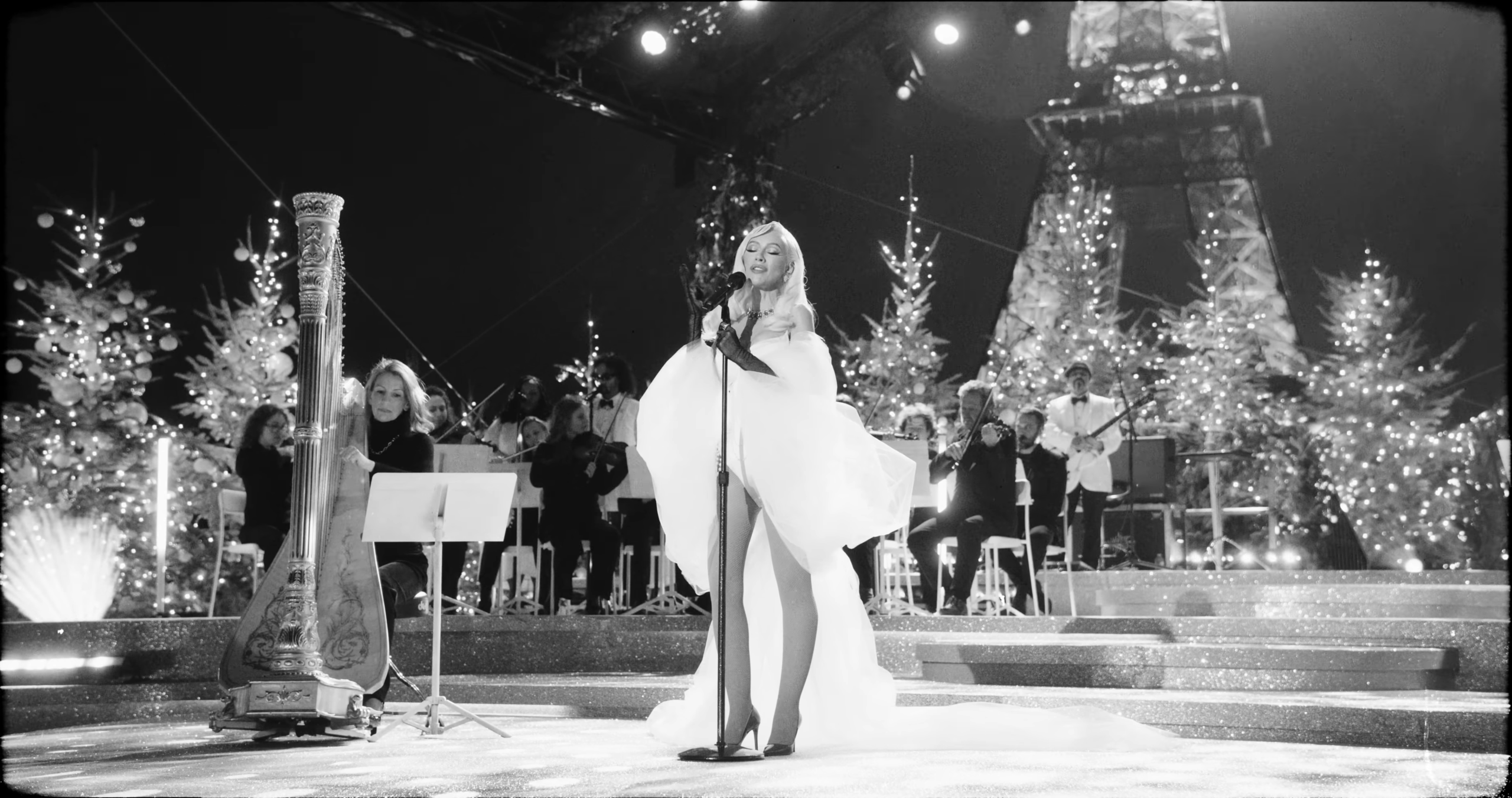 Christina Aguilera debuts Someday at Christmas live from the Eiffel Tower, ahead of her holiday concert film release.