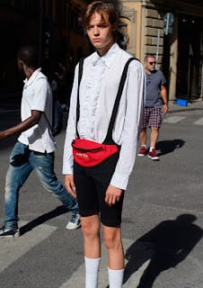 Nicola Indelicato SS19 collection finds its first inspiration from the 1953 William Wyler’s movie “Vacanze Romane”. The designer revivals the scenario through the story of a young boy. As in the movie, this collection covers the theme of love: a love story version 2.0, spreading around the young age, exploring and re-performing the Italian classic romance, illustrated by poplin’s ruffles which reminds as well the 50’s fashion.