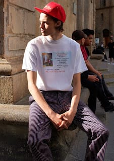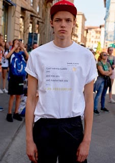 The designer approach love with difference and modernity imagining his young romantic traveler, ending a long day of visits through museums and the city, getting in contact with the love by way of the chat universe. Here comes the new statement of the season, the illustration of the “modern summer love”, “I just wanna cuddle you and kiss you and maybe fuck you……” printed on t-shirts. Faithful to Nicola Indelicato’s manifesto, the core elements, sexual, historical references and overall Indelicato aesthetic are blended together.