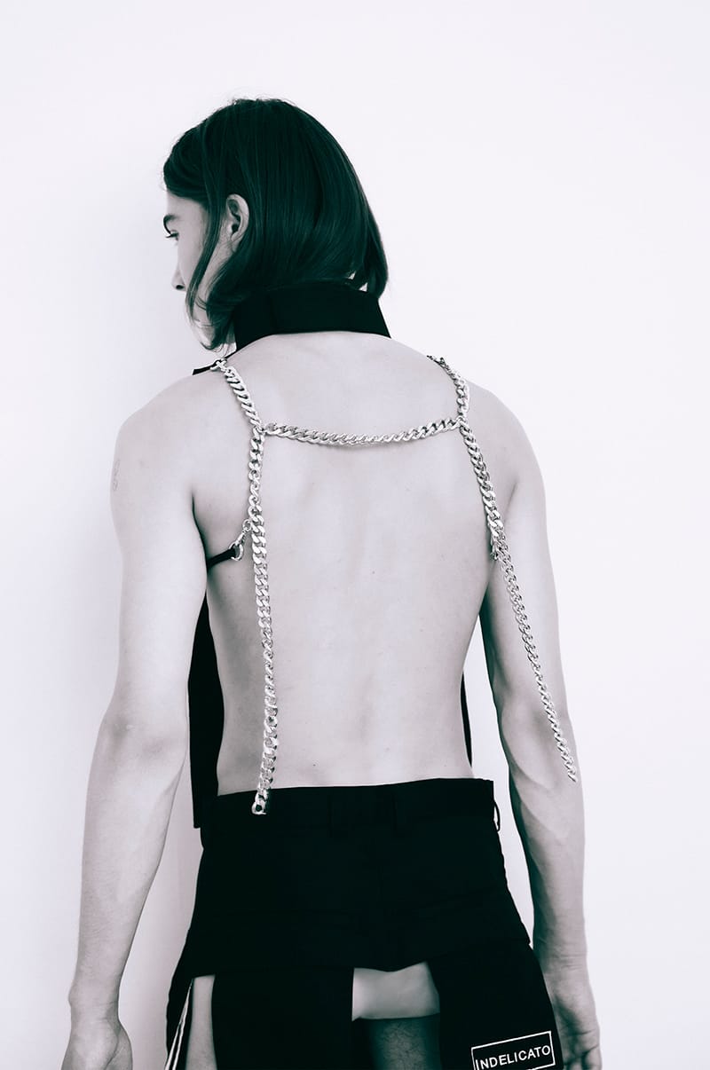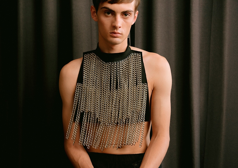This forced seclusion has been translated into the garments by the use of chains and thick metal details. The asymmetries of some garments arise from the need to use the few fabrics available at that time as all supplying companies were closed too and to make the most of what was already in stock, so to support sustainability, which has become a crucial theme especially at this moment in time.