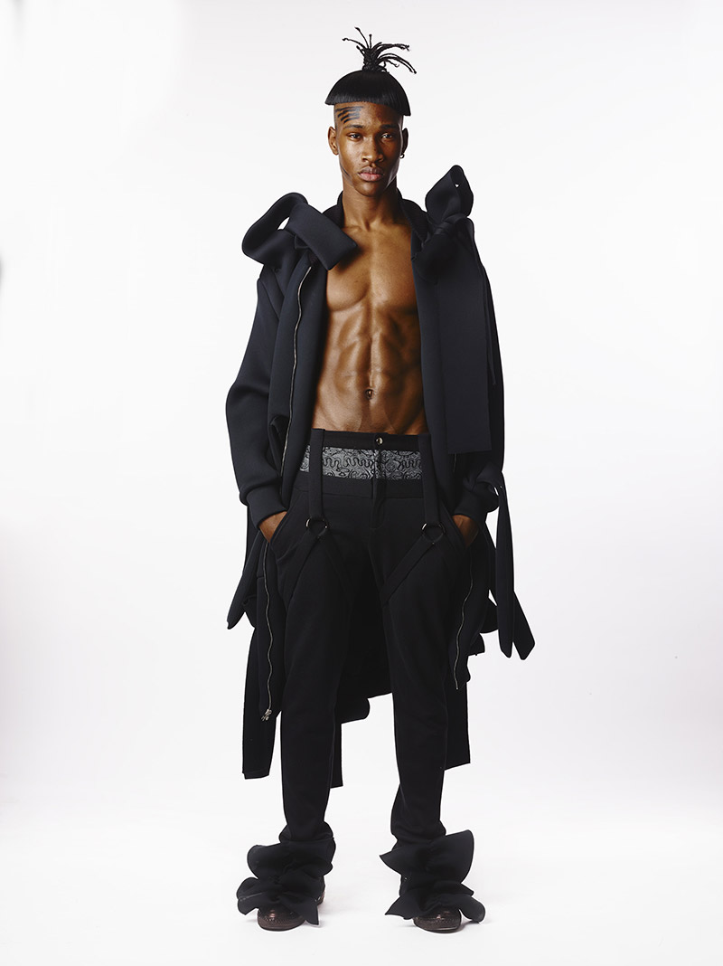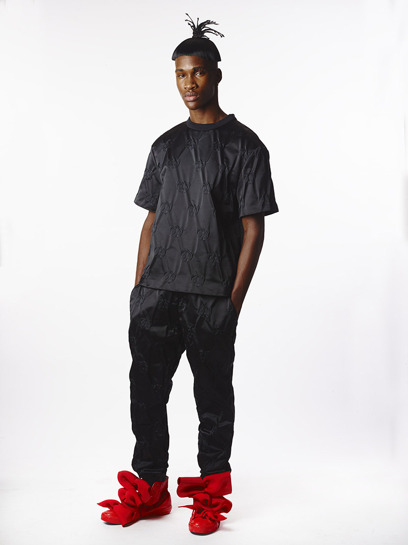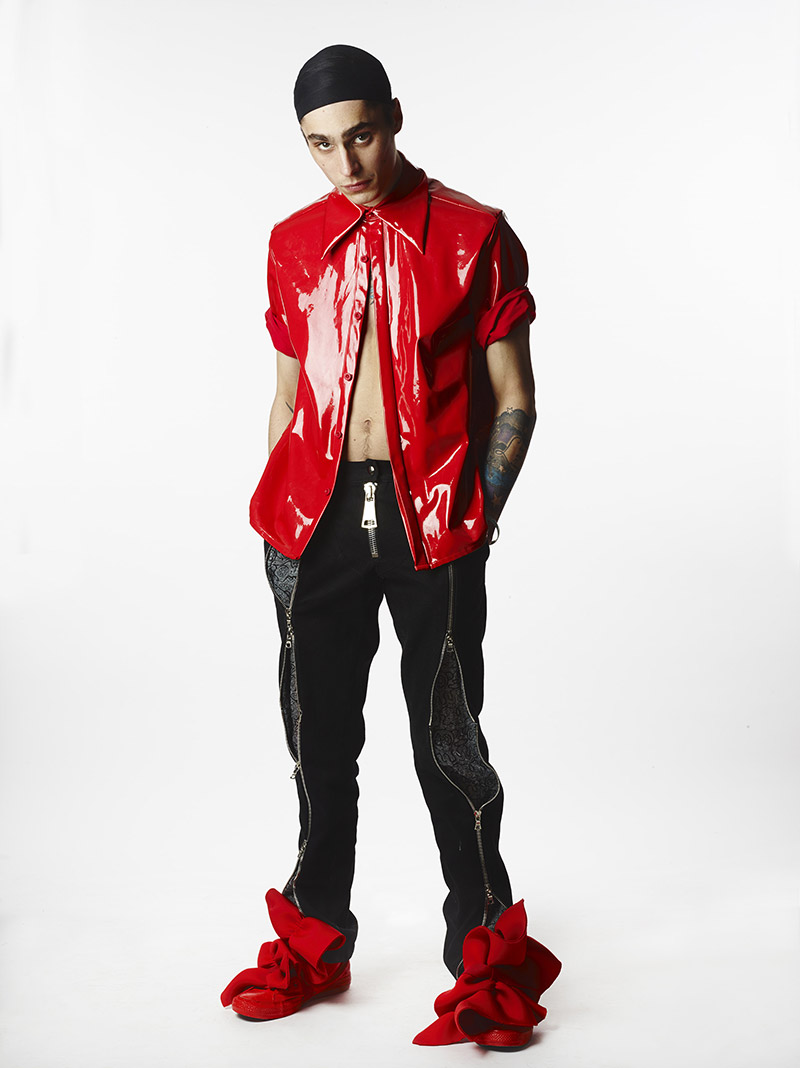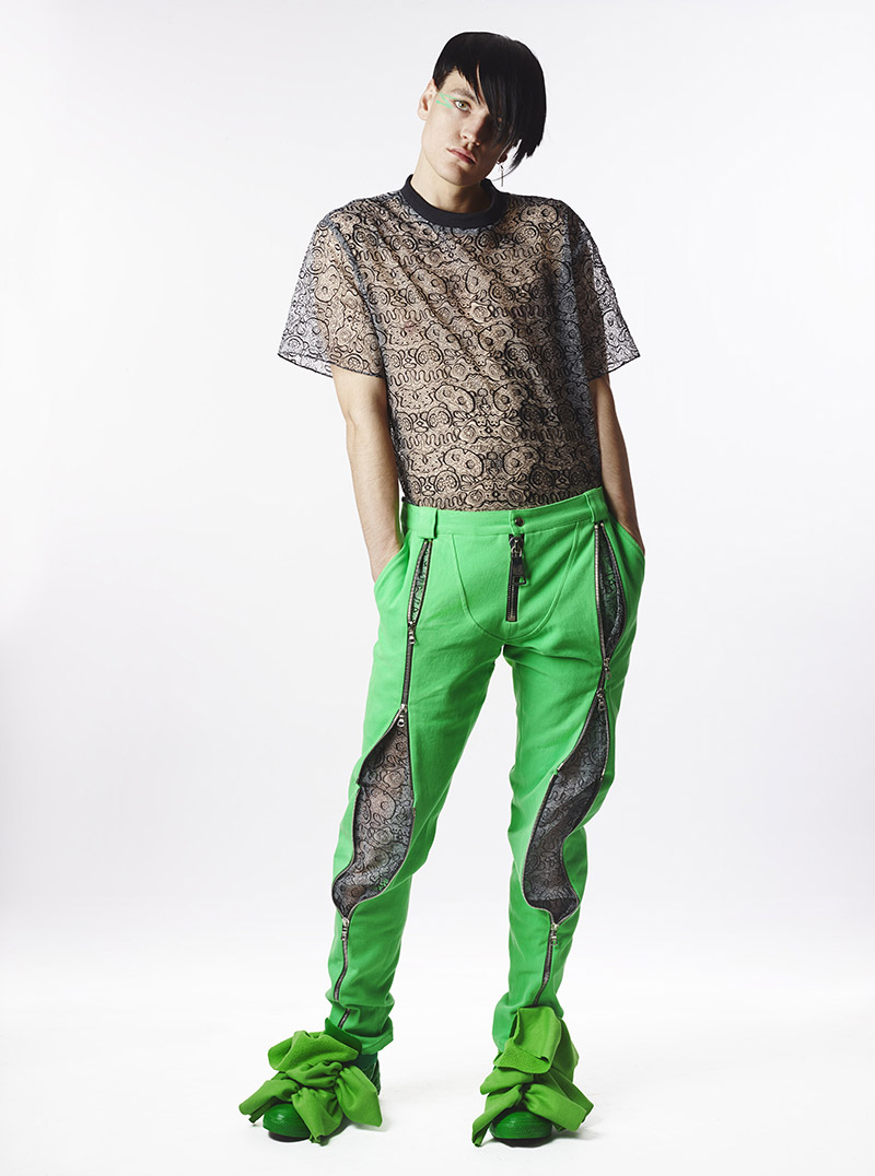 Chunky zips provide visual threads through the collection appearing throughout in true reflection of Nicopanda’s punk vision. Bows continue as a strong theme carrying on from last season in perfect balance between saccharine sweetness and sophistication. Custom embroidered lace created from Nicola Formichetti’s own doodles appears across dresses, shorts, pants and flamboyant Disco-inspired statement ruffles run through the collection. Nicopanda debuts bags and accessories in vinyl, faux fur and leather named after Nicola’s dogs Tank and Bambi.