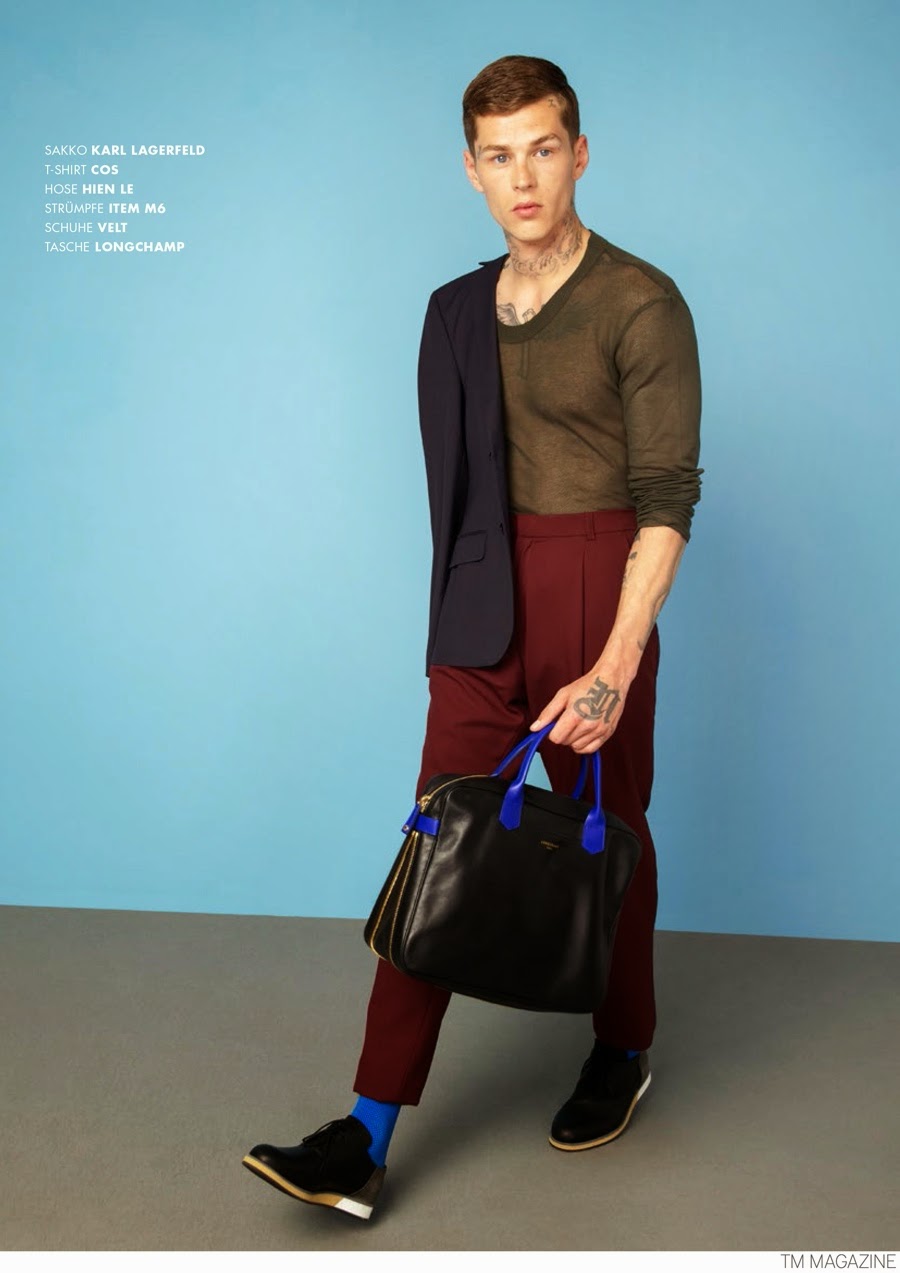 “Age of Technicolor-Uno model Norman Theuerkorn earns his latest editorial with work in TM magazine. The tattooed model connects with fashion photographer Angelo Ghidoni for a colorful menswear outing. Wearing a variety of hues and modern proportions, Norman dons smart suiting, knitwear, quirky socks and more as styled by Alexandra Heckel. Labels for the bright outing include Karl Lagerfeld, COS, Sandro and Tiger of Sweden.” – The Fashionisto