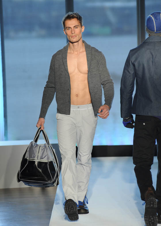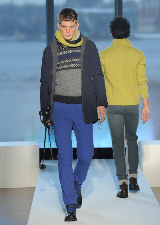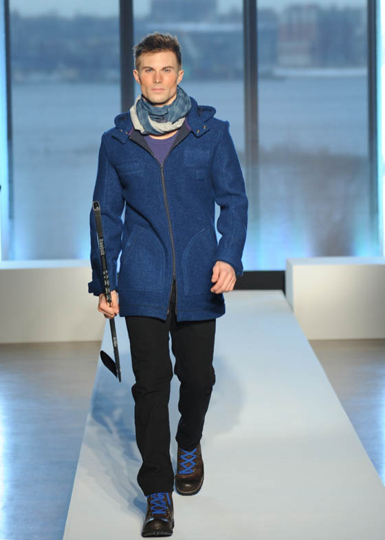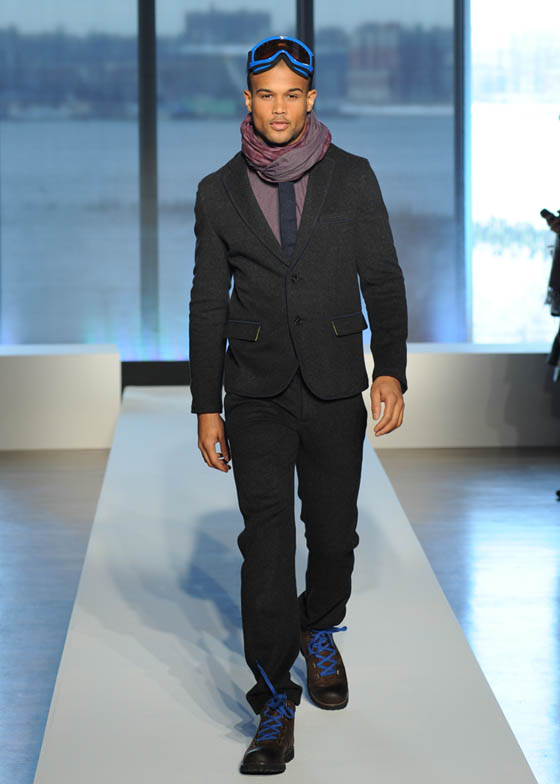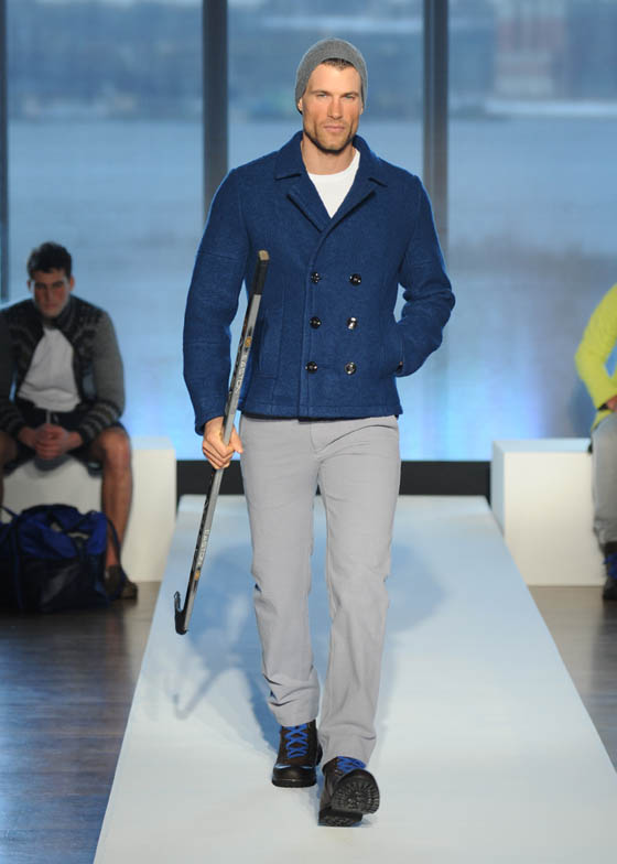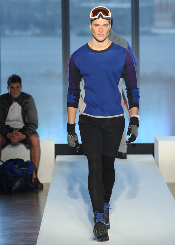 “Call me Canadian (I am), but I’m probably going to love any collection that starts with a hockey scrimmage. Last season it was Bike Polo. This year designer Luis Fernandez had his guys suited up for some shinney, decked out in his Number Lab apparel. When the skates came off and the music dropped, that’s when it was really game on. “Fernandez has produced a vivid and well-structured collection, a look that is unapologetically sporty and fun, but still clean and European. Models came down the runway in chipper blue knits, clean cut jersey and, at one point, a grey two-button jacket with bold blue trim, but they were also sporting hockey sticks, goggles, and skis. It was as if the Swedish Winter Olympic team had descended on the West Village. You had to stop and stare, and you pointed and laughed with your friends, but you also kind of wished your boyfriend had that sweater. And those pants.