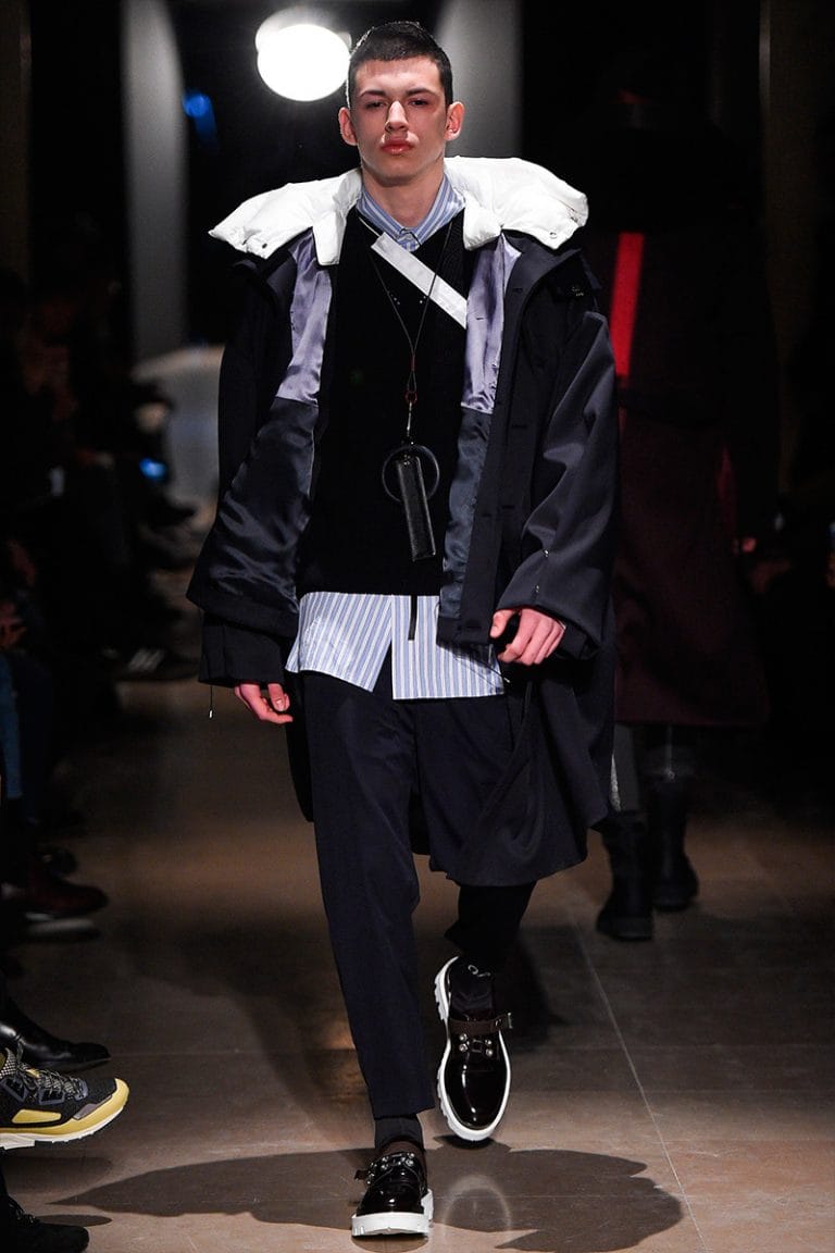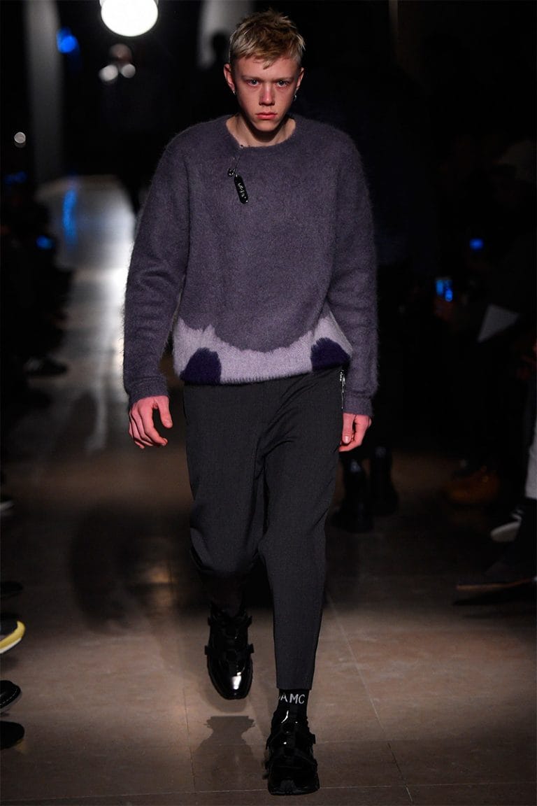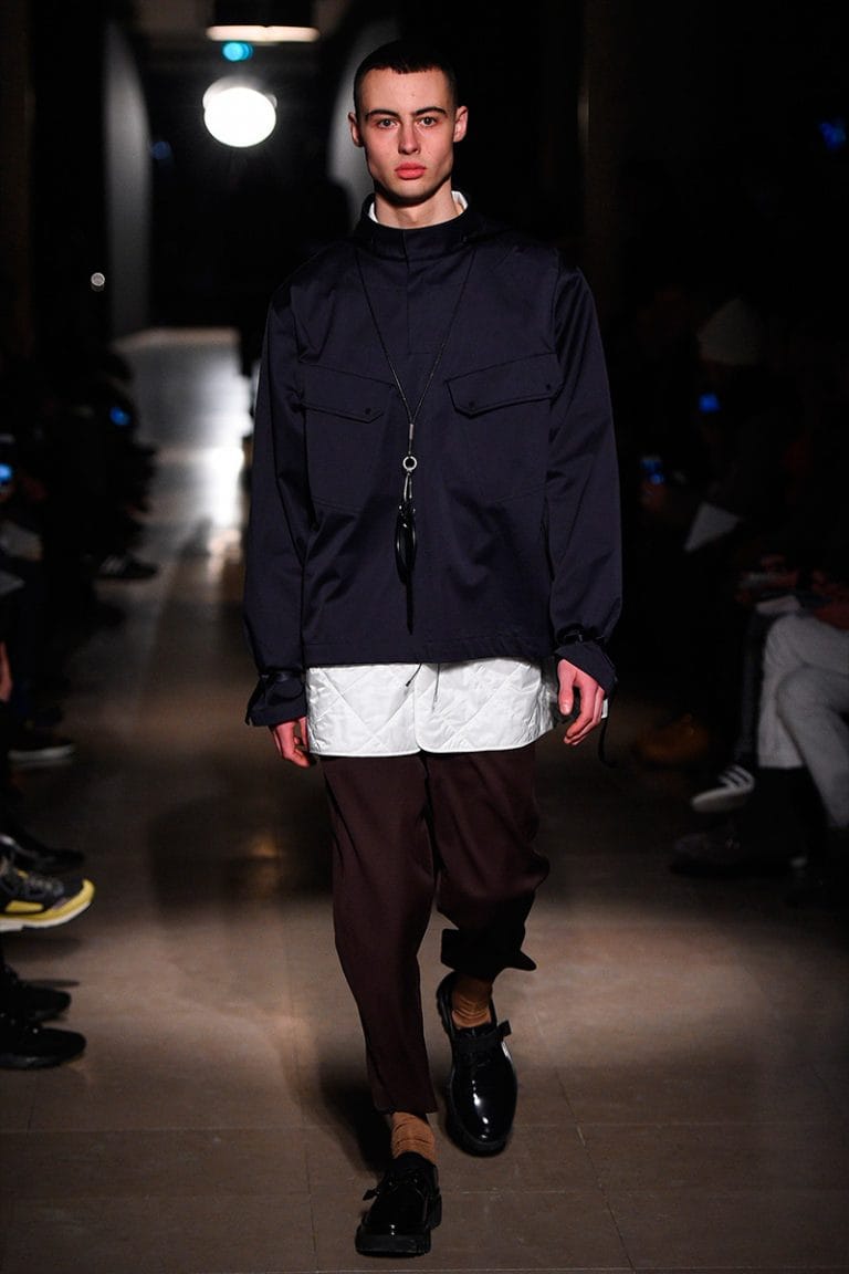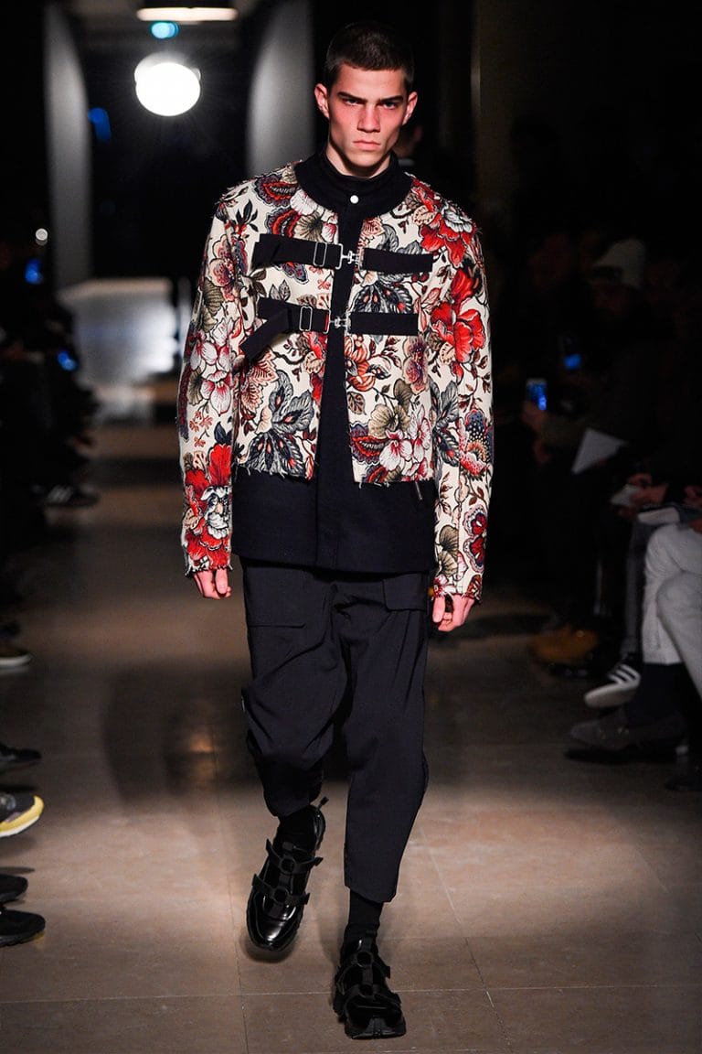 “For the inaugural OAMC show, an exploration of night codes that inform menswear. Tactical SWAT detailing is re-appropriated and re-fabricated. Armor, rapping, dimensional pocketing, modular accessories, identification badges. Formal codes, presented in fabrics and motifs, re-shaped and re-propositioned. Hand-itched reversed-construction tailoring, foulard carré prints on silk robes and shirts, external basting and pleating, gobelin woven jacquard as overcoats and accessories.