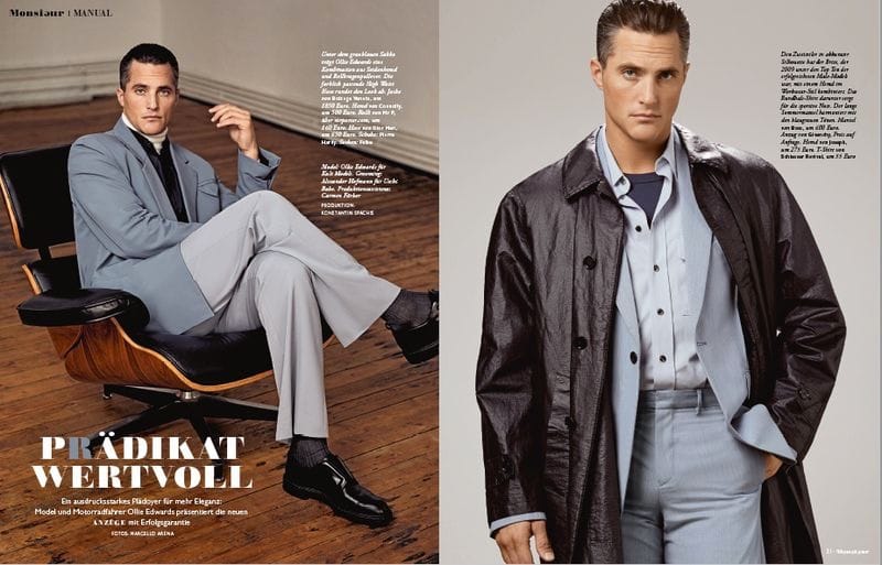 “Ollie Edwards delights us with a stylish moment for the latest edition of Monsieur from Madame Germany. The top model dons delicious designer looks styled by Konstantin Spachis. Fashionable proportions and a splash of leather come together as Ollie poses for photographer Marcello Arena. Easily stunning, Ollie wears standout fashions from brands like Officine Generale and Ralph Lauren.” – TheFashionisto.com