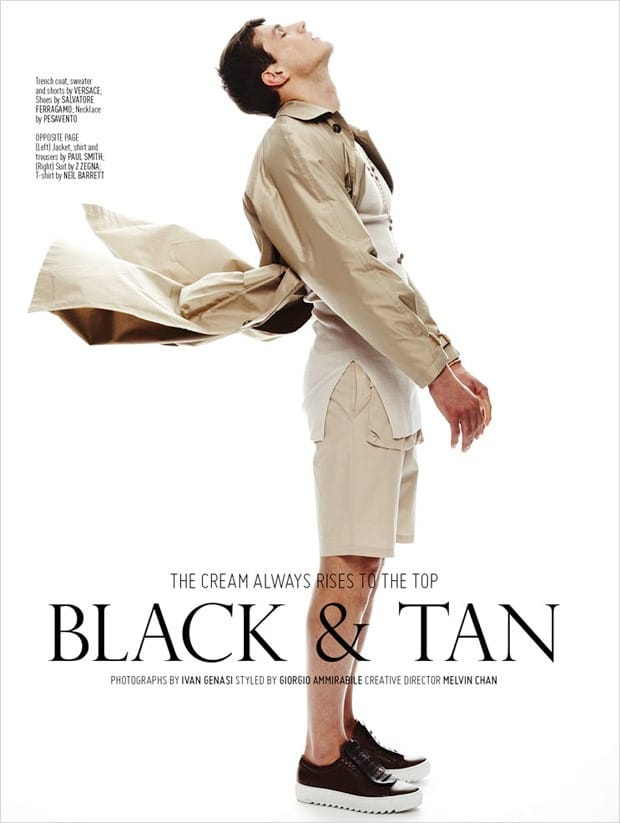 “Models Oran Katan at Yuli Models, Sacha Legrand at Why Not, and Konstantin Quandt at Fashion team up for Black & Tan story coming from the pages of August Man‘s latest edition. In charge of photography was Ivan Genasi, with styling from Giorgio Ammirabile. Creative direction by Melvin Chan.” – Malemodelscene.net