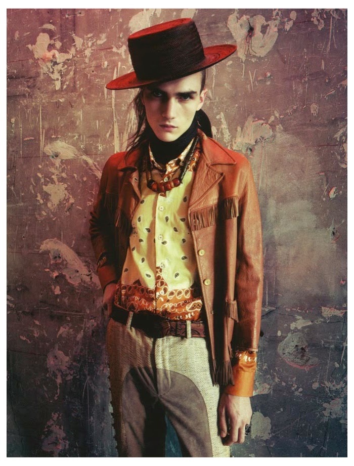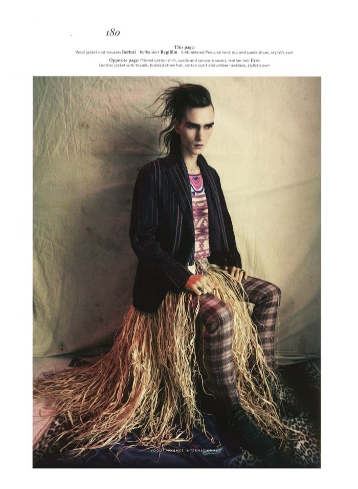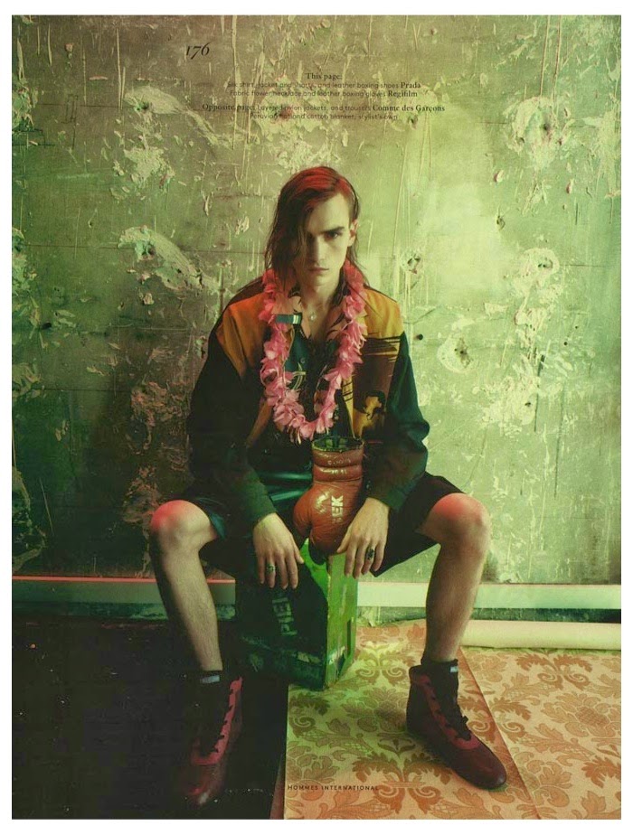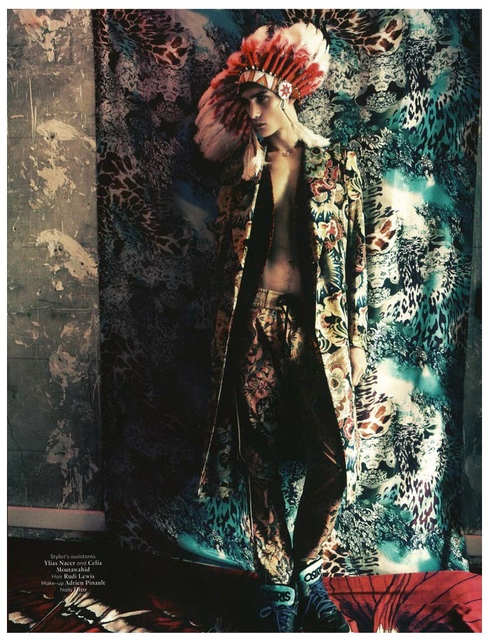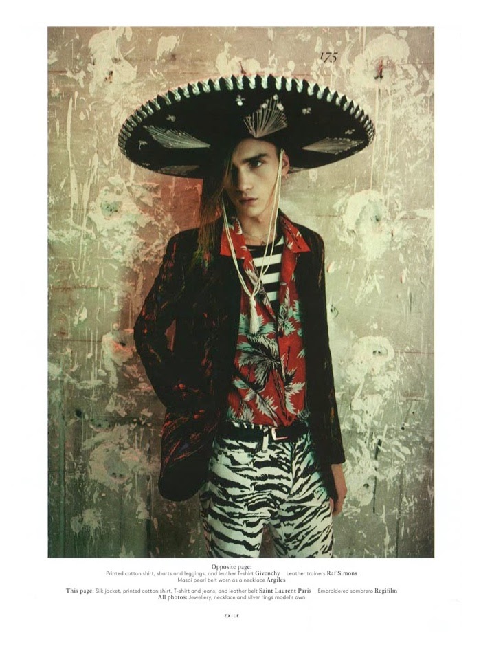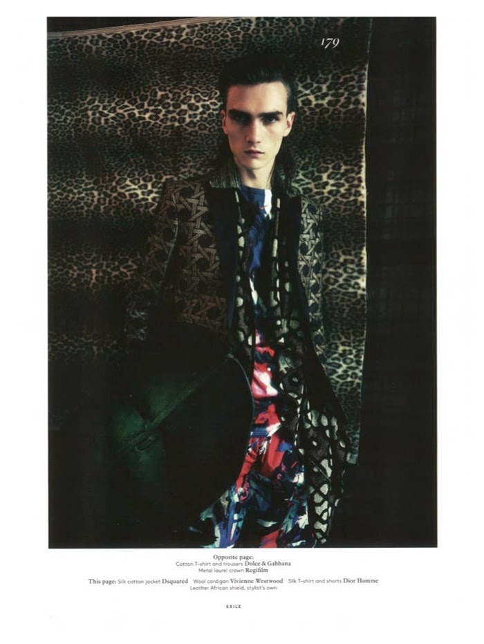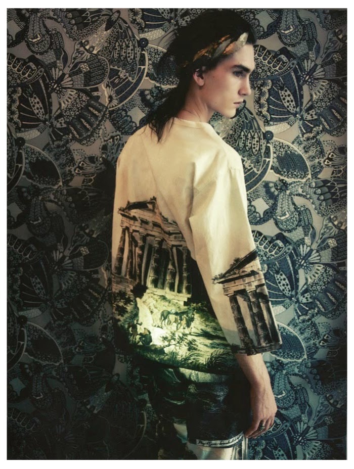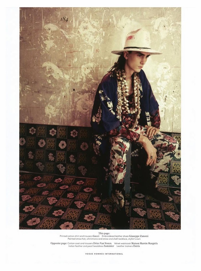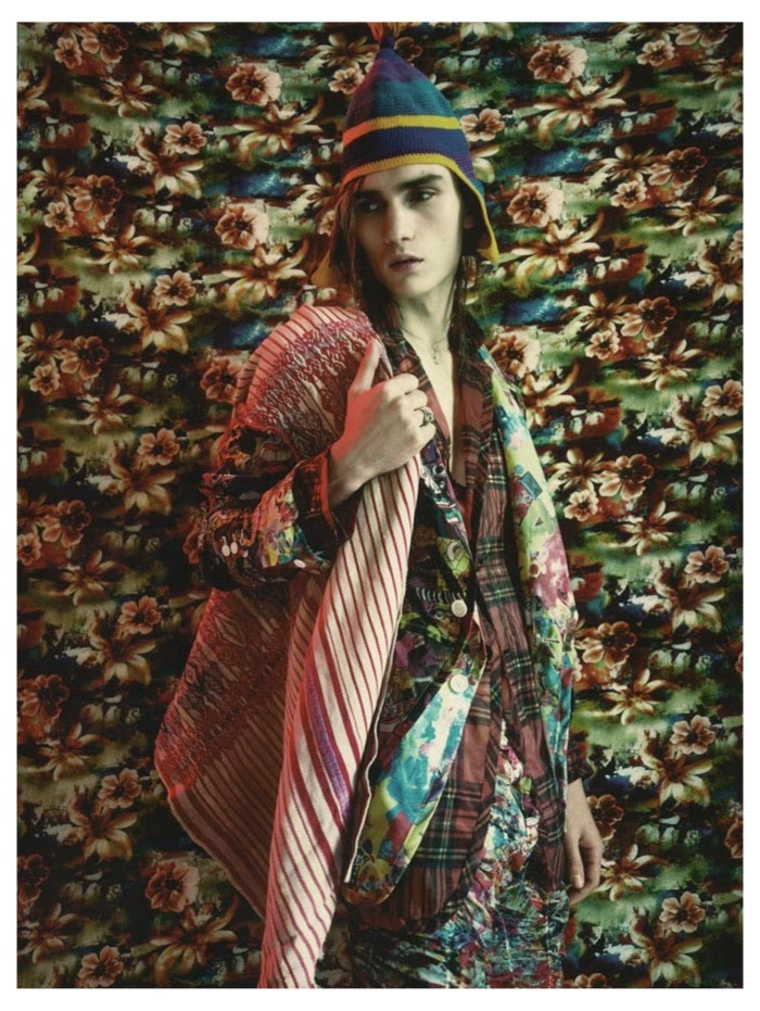 Exhile–Capturing the dark side of traditionally cheerful prints, photographer Paolo Roversi collaborates with Anastasia Barbieri for a story in the spring/summer 2014 edition of Vogue Hommes International. Referencing season themes such as Prada’s disturbed paradise, Barbieri outfits Bananas model Gryphon O’Shea in a phenomenal series of printed looks with great character. Courtesy of – thefashionisto.com