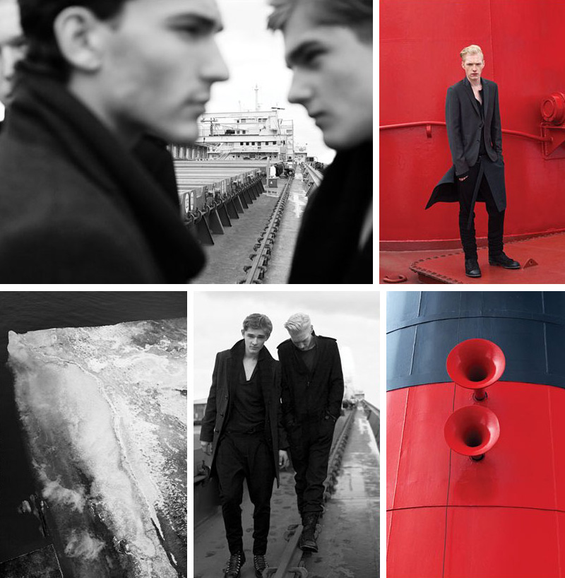 Venturing out to sea, Philippe Dubuc recruits Taras Koltun, Shawn Tavares and Jesse Haddock for his fall outing. Presented as theNorthern Sailor, fall’s range looks to offer an urban take on the military motif with clean lines and the subtlest of details found in the collection’s attention to form and geometrics. Capturing the somber atmosphere with a relentless cool, Jason Last films Dubuc’s trio on board. – Courtesy of thefashionisto.com