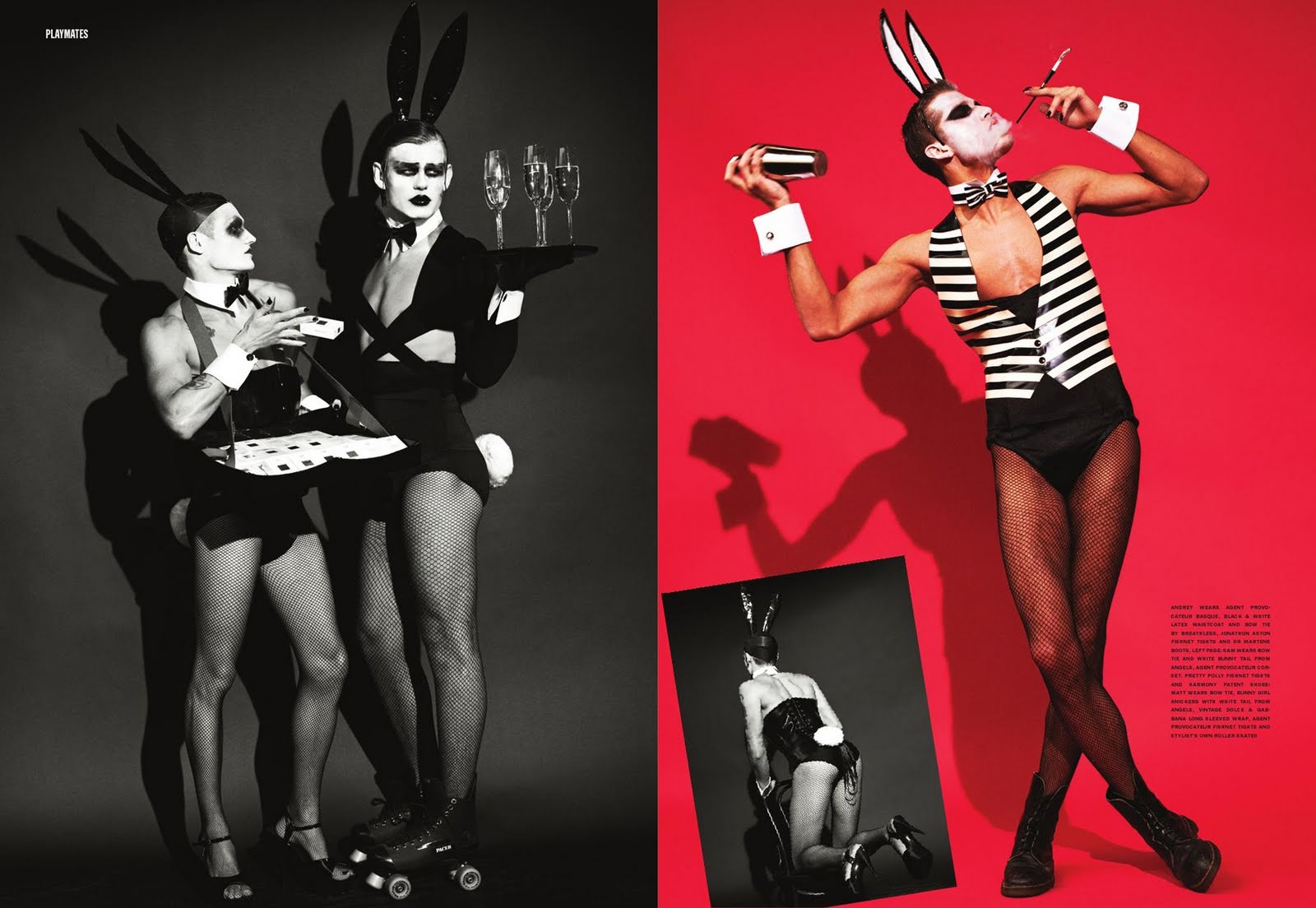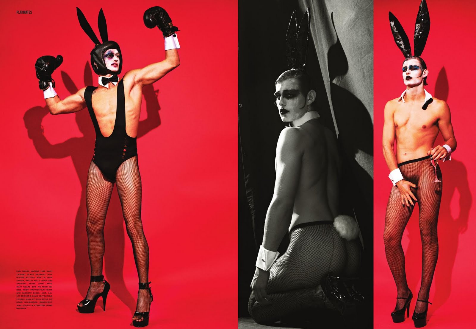 Mariano Vivanco and Luke Day shoot and style this risque shoot for Candy’s second issue that pays homage to a gay version of the classic Playboy Bunny. Andrey Zakharov, Stefan Pollman, Thom Morrell, Sam Lawson and Matt Trethe. Courtesy of – hommemodel.blogspot.com