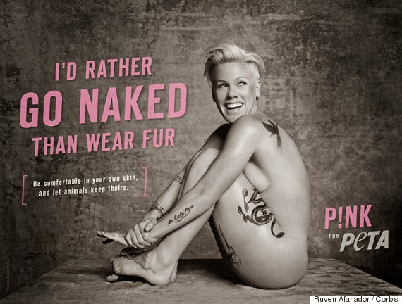 The always outspoken P!nk bares all for the animals rights group PETA in the latest campaign for ‘Rather Go Naked Than Wear Fur.’