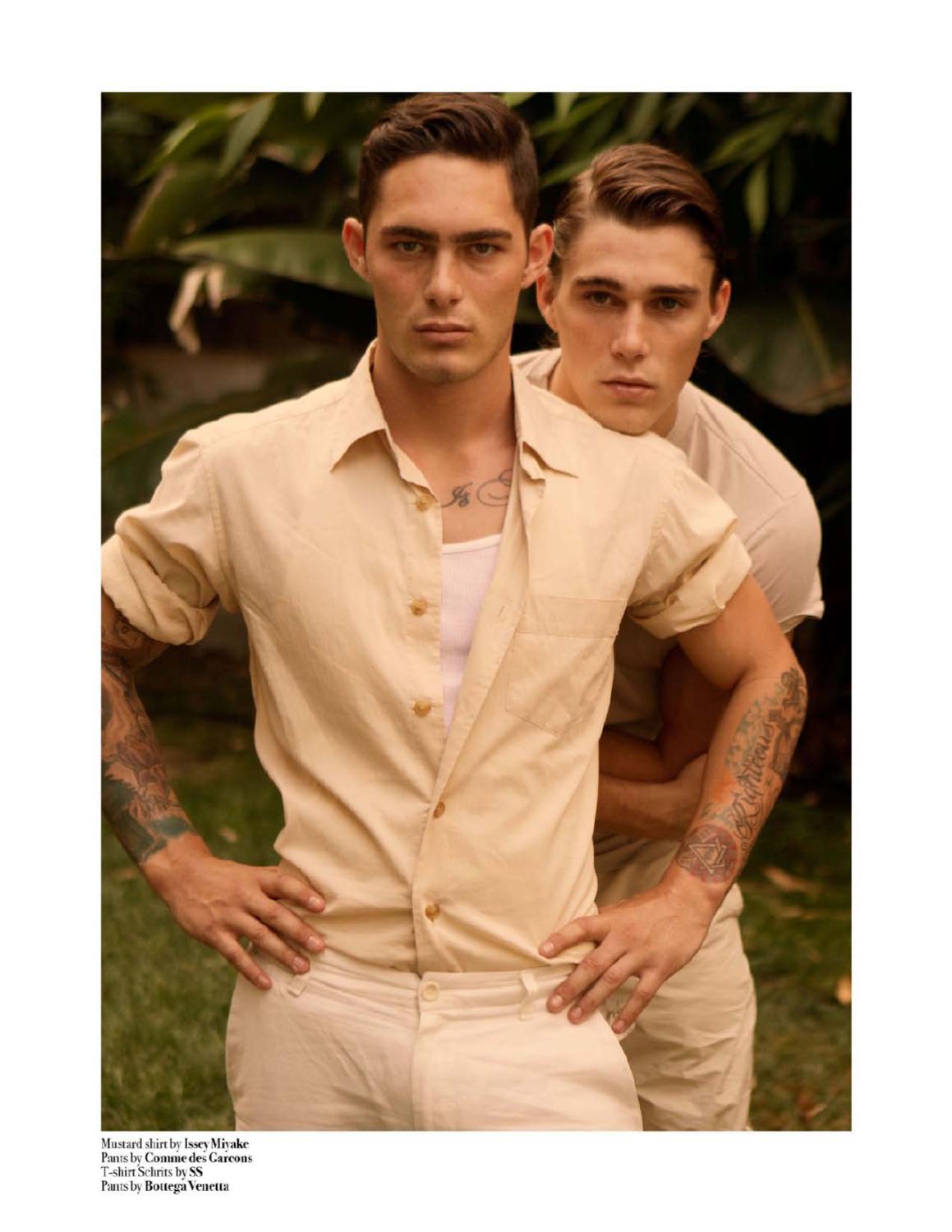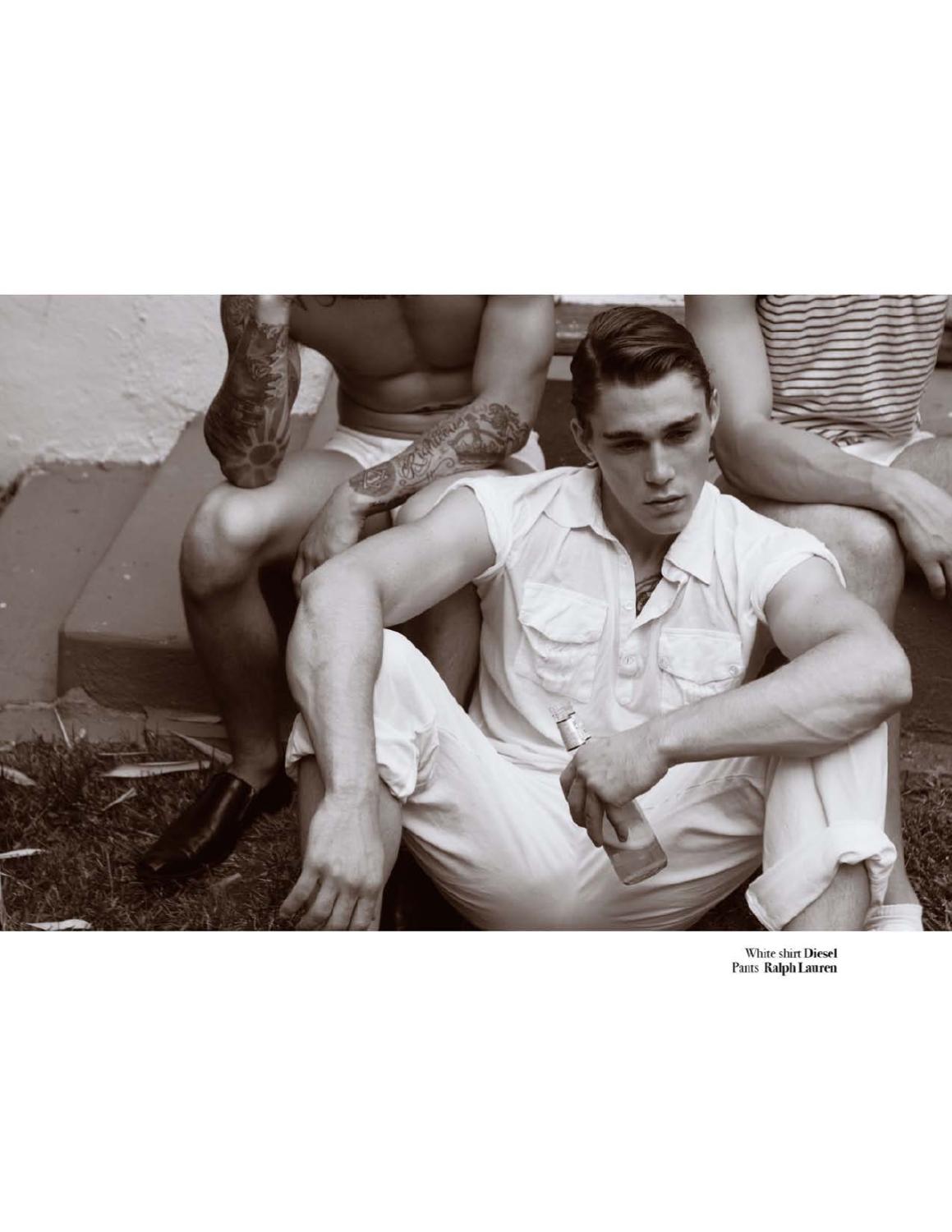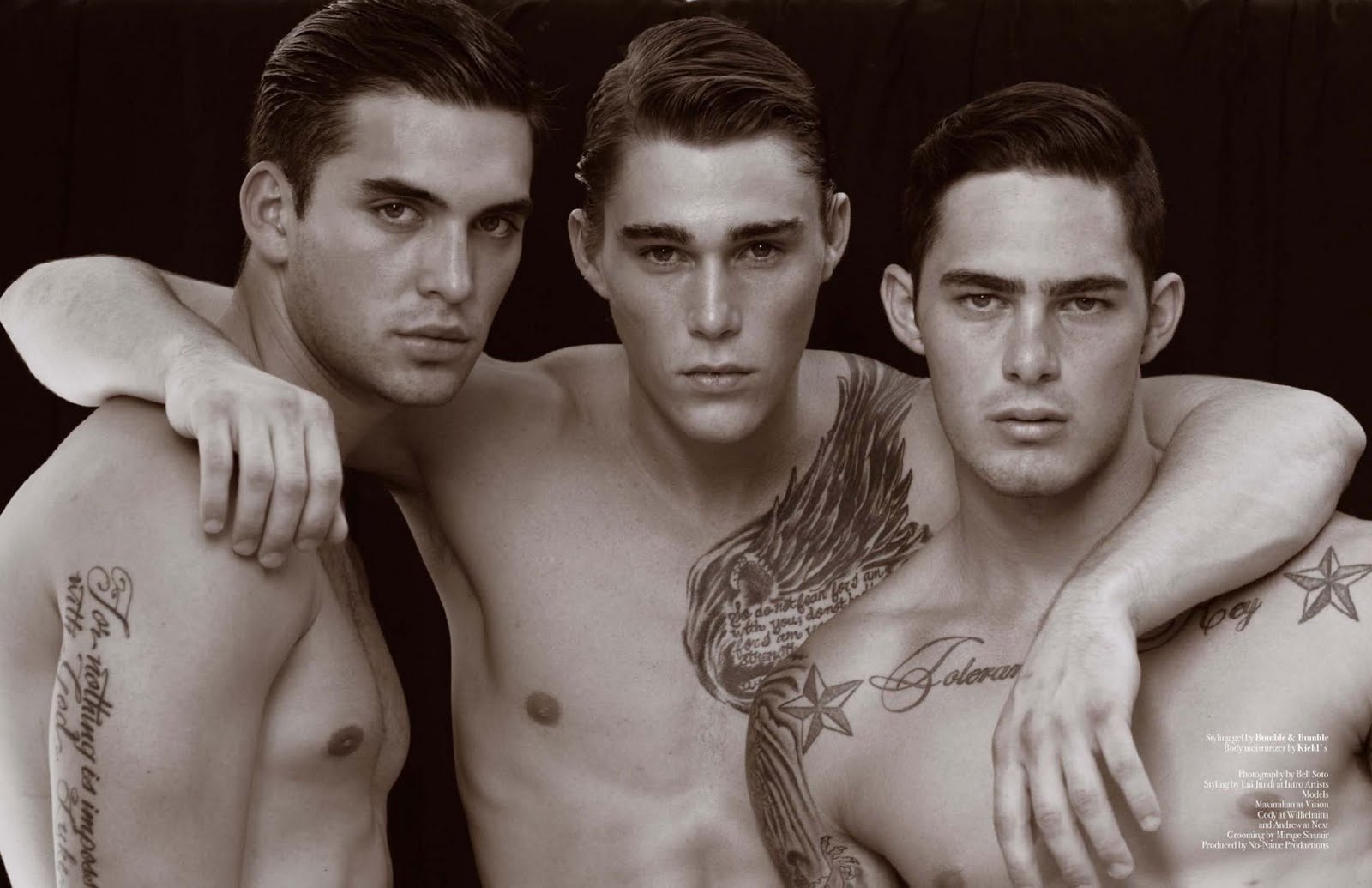 Bell Soto captures Maximilian Silberman, Andrew Gabriel and Cody as former military men in this shoot for Carbon Copy and the result is tinged with homoeroticism. Lui Jundi styles the buff models in a mix of bottoms and accessories from Philip Lim, Issey Miyake and Bottega Veneta while keeping the skin from the waist up bare. Courtesy of – hommemodel.blogspot.com