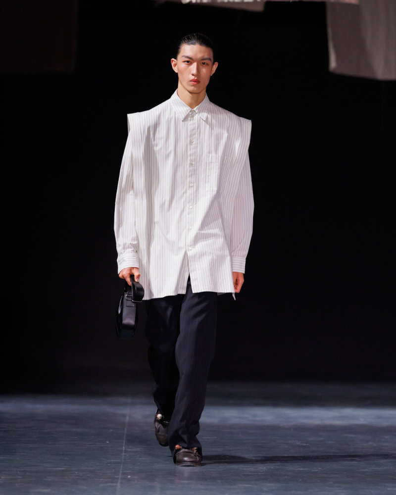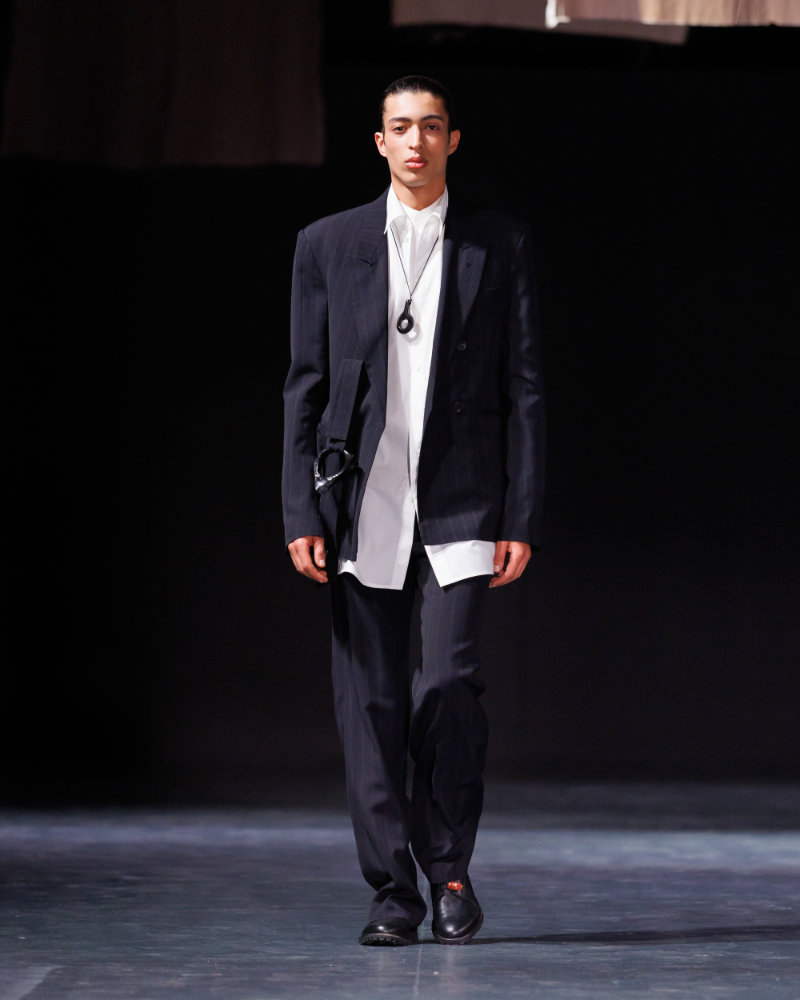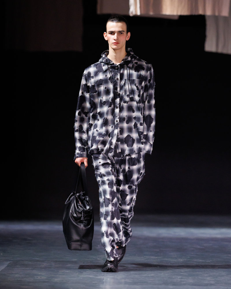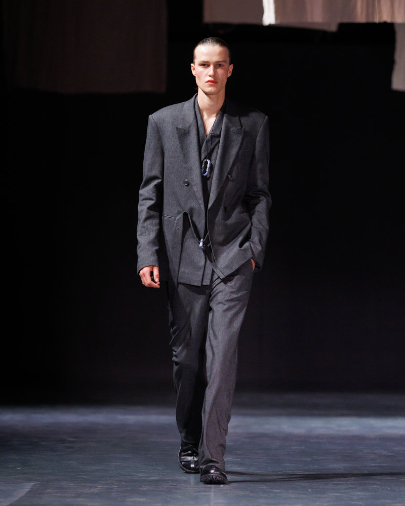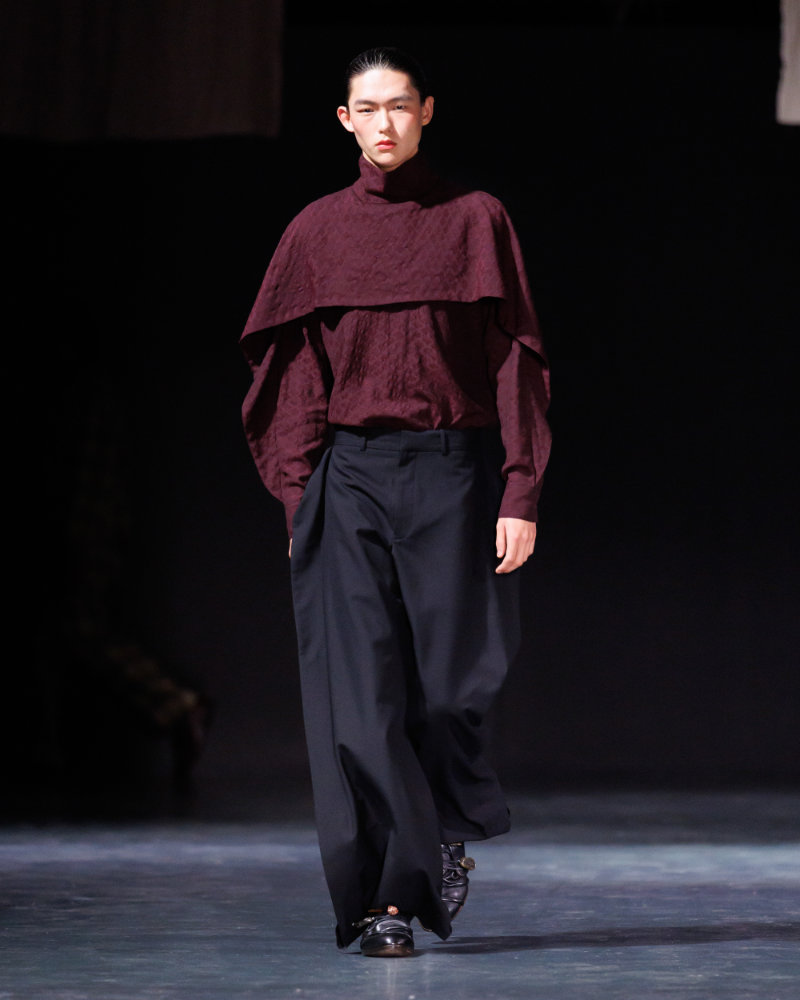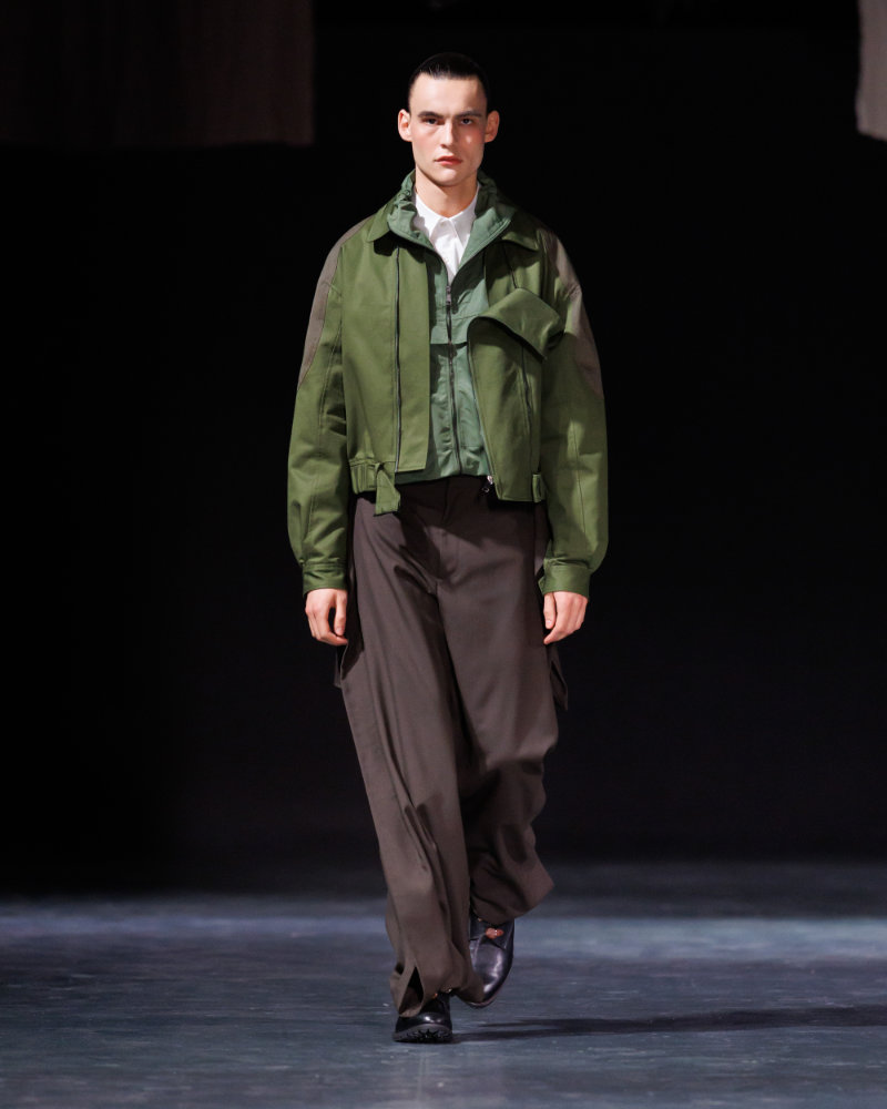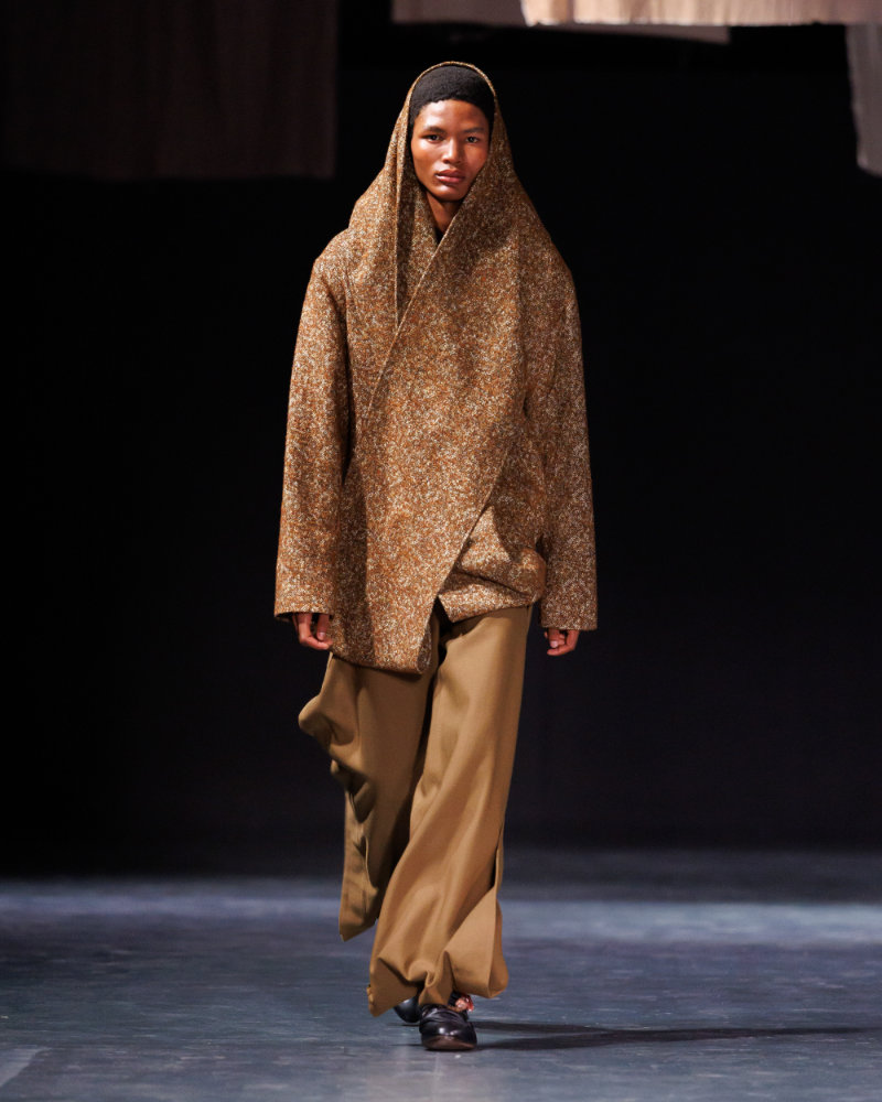 Tailoring remains central, but softened by draping, fluidity, and subtle military references that nod to the brand’s roots. Textures shift between wool, brushed cotton, and structured knits, creating a tactile story of warmth, protection, and introspection.