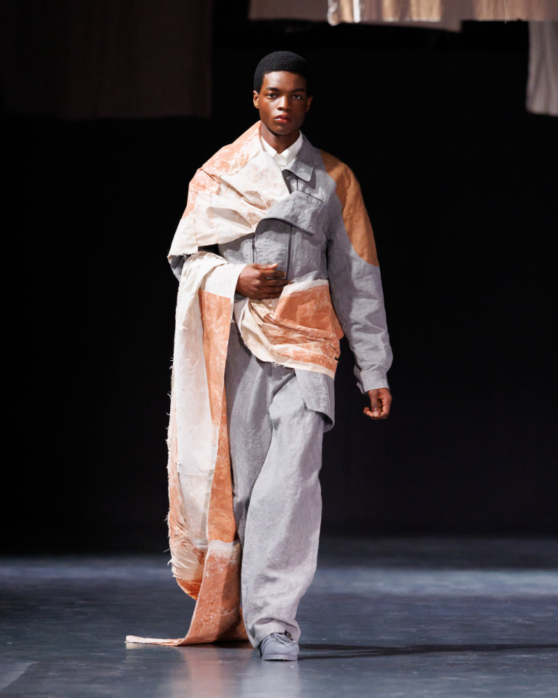 “Memory and the House of Remembrance” leans into sculptural silhouettes, layered textiles, and a palette that moves between desert neutrals, shadowed charcoals, and ceremonial jewel tones. The garments feel lived‑in yet elevated, grounded yet ethereal — a balance Qasimi has mastered season after season.