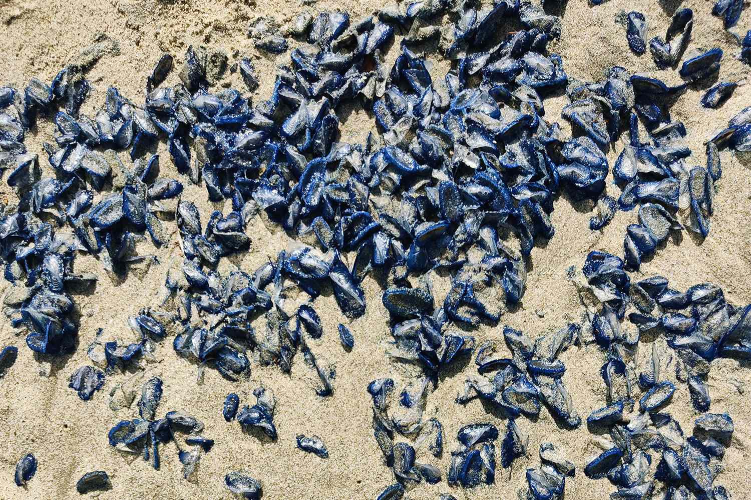 Officially called velella. This 2026 seasonal Spring, see these specific colored hues along the Pacific Coast from Santa Barbara to San Francisco, Stinson Beach and north to Oregon.