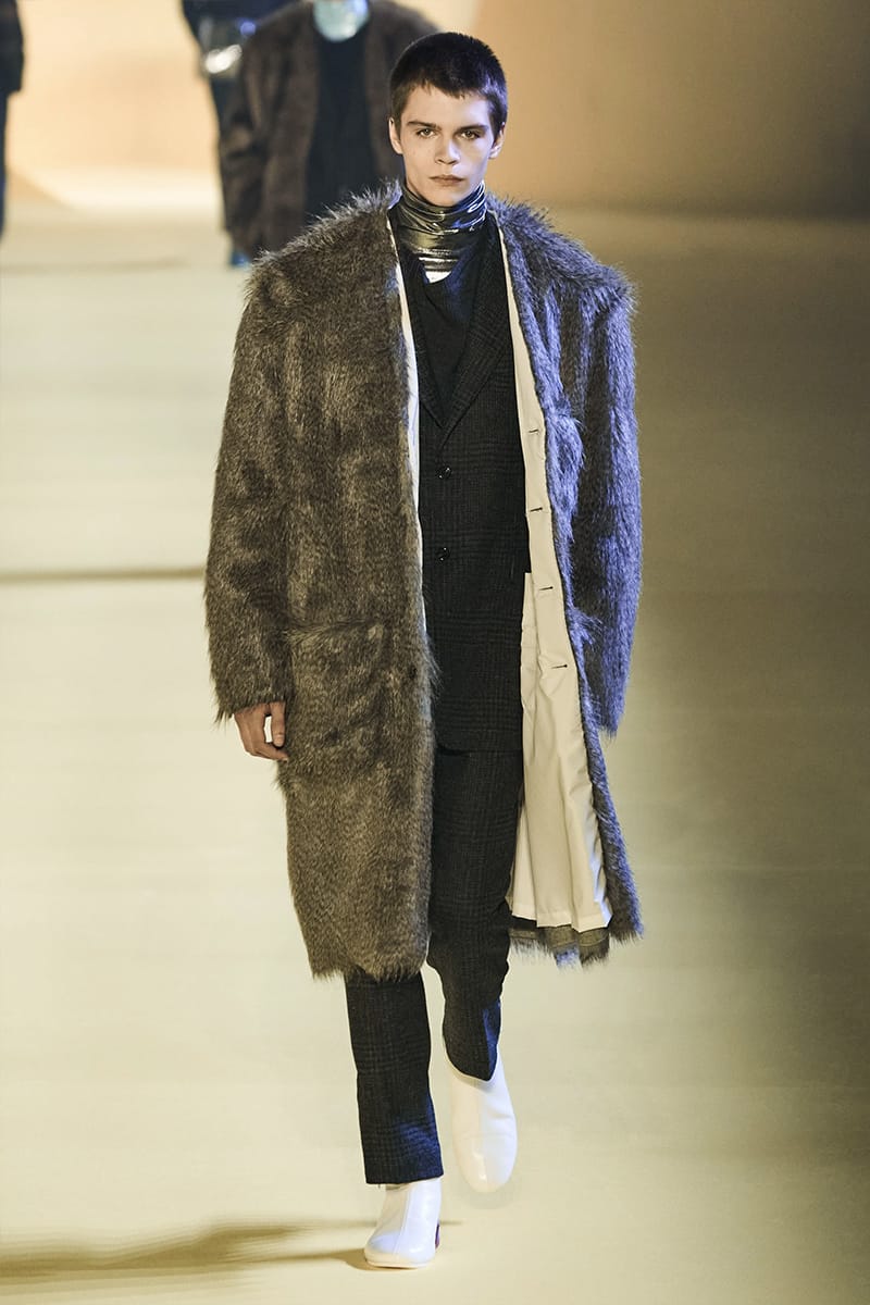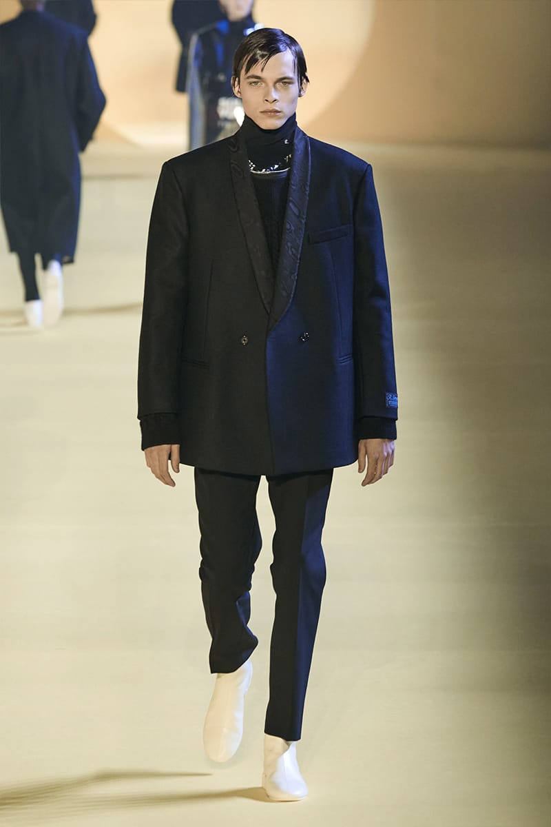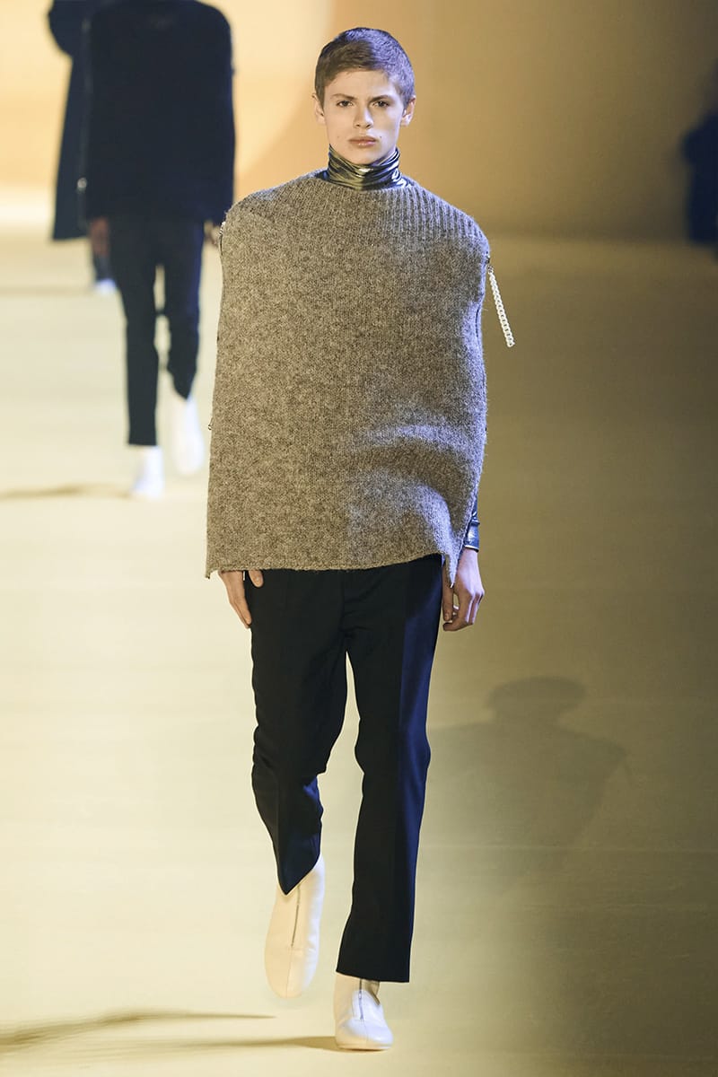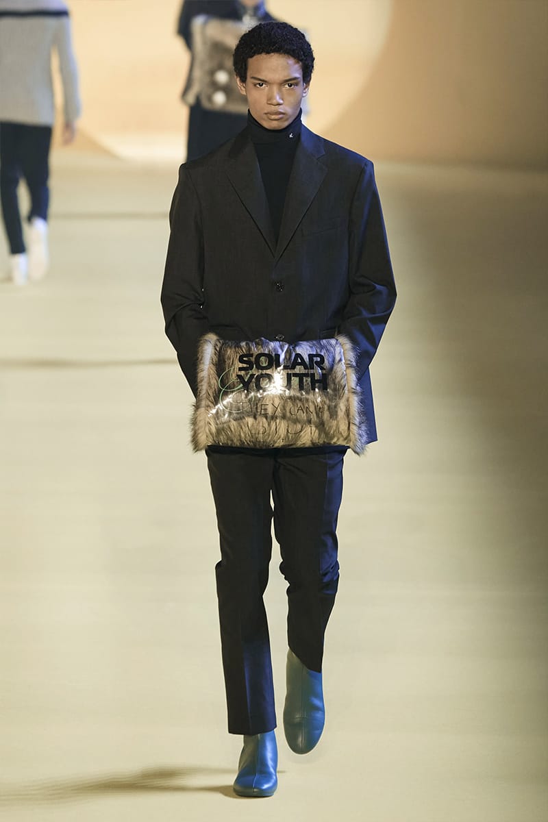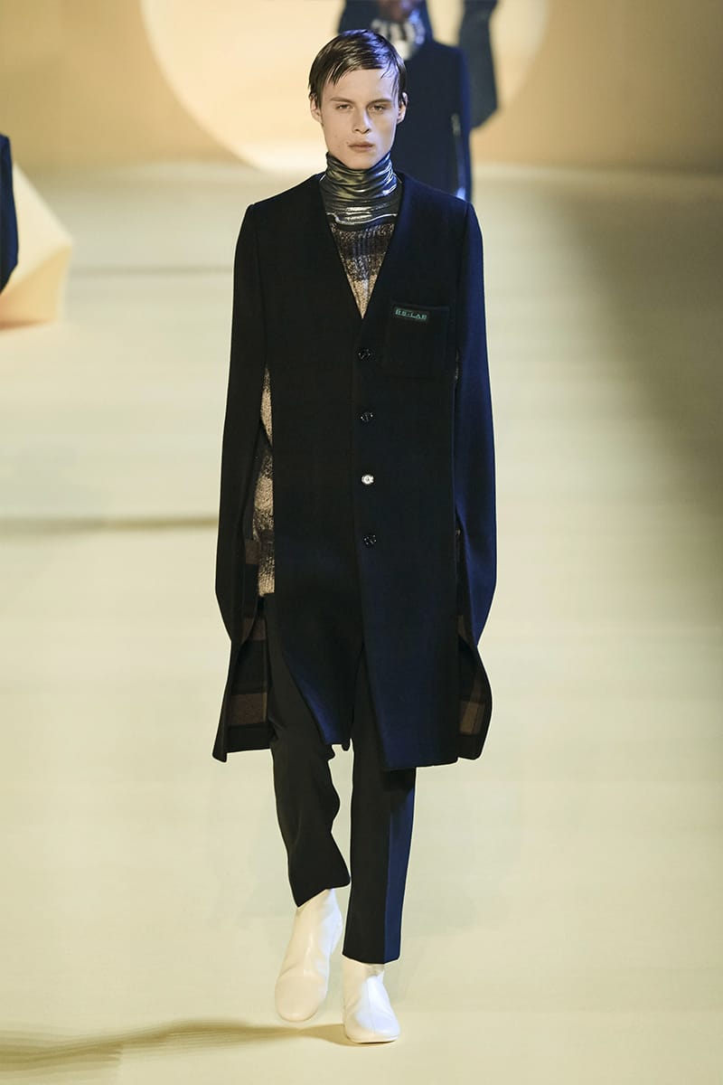 And such makes us touch on the clothing. Elegance, sophistication gripped by sci-fi poignancy were plentiful. Glimmery-vibed detailing decked propositions, featuring futuristic neck-base layering in silver, so chromatically-blatant yet so excellently executed. Imposing a sense of edge and structure were the parade of military-style coats, set against the tubular-structured knits and paired with sumptuous footwear offerings. Back to school (with the blazers) and collegiate jackets were a further go-to, aided by a yet so powerful pulse of fine cuts that adorned the full collection. On the Simons index of wearability (theoretically speaking), every tailored piece was made for a man whose life could tailor on earth. But this showed us something. Almost like an unresolved enigma: the ending felt quite imperceptible, so where do we take-off from here?” – FY Magazine.es