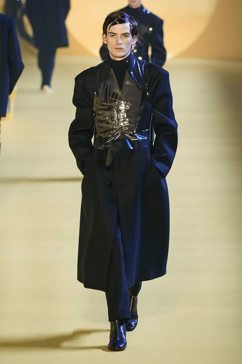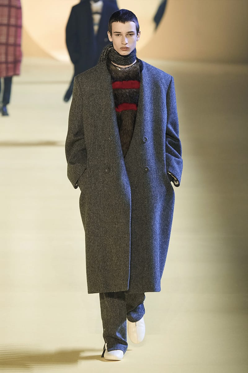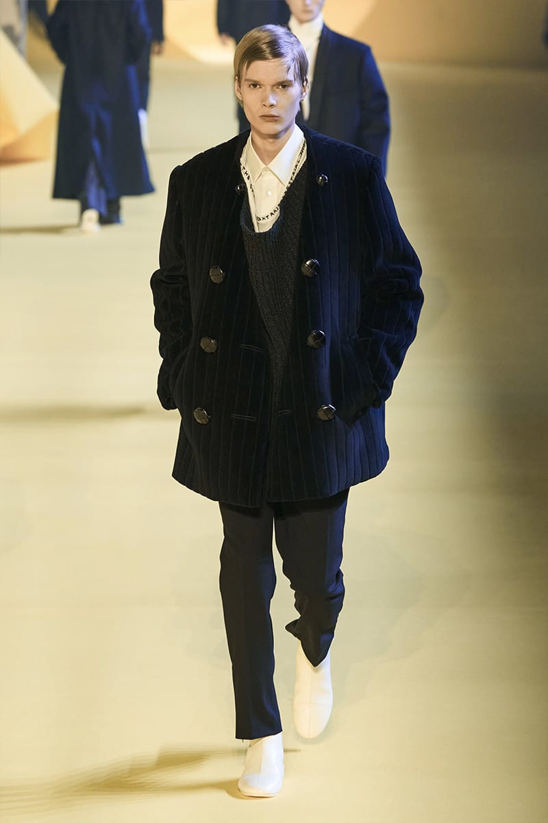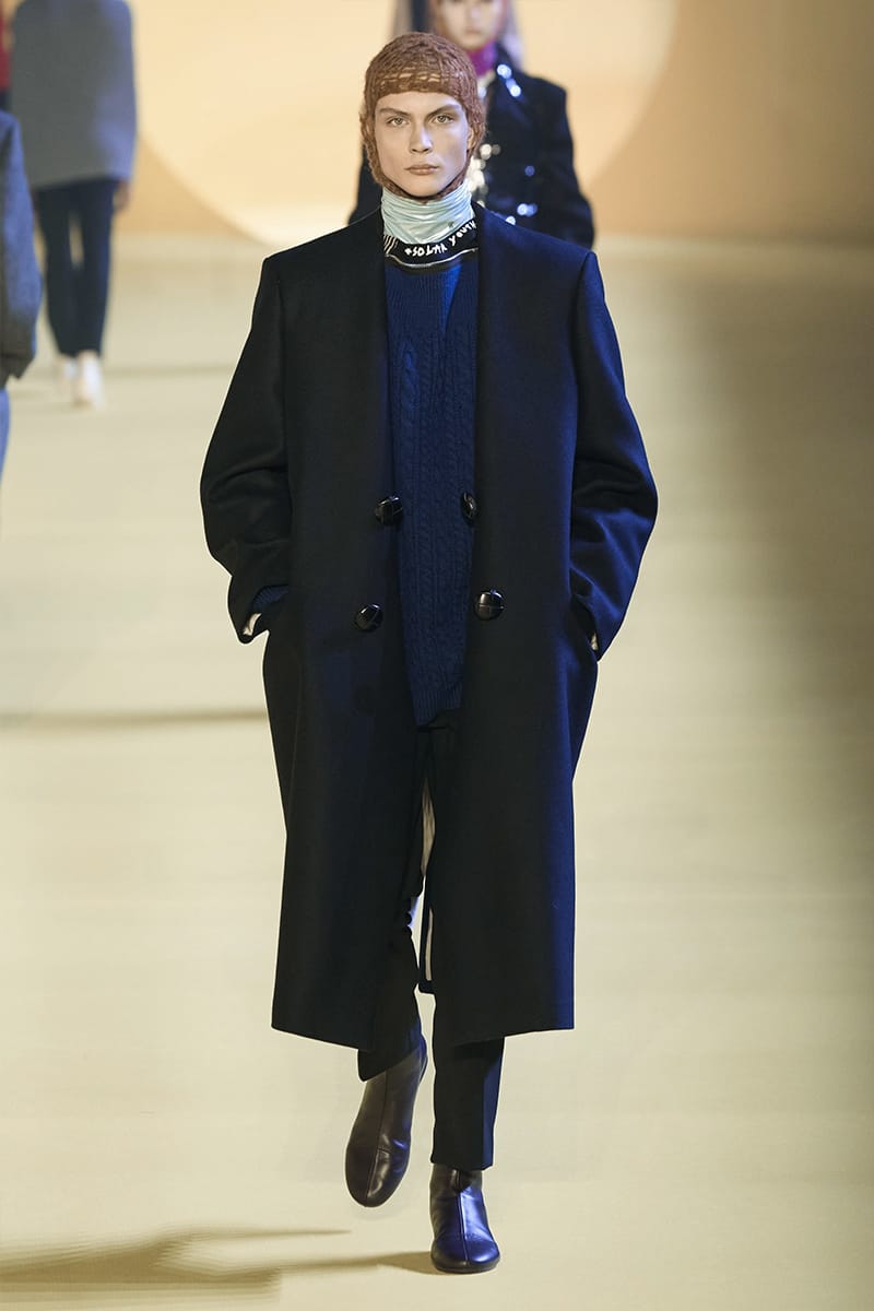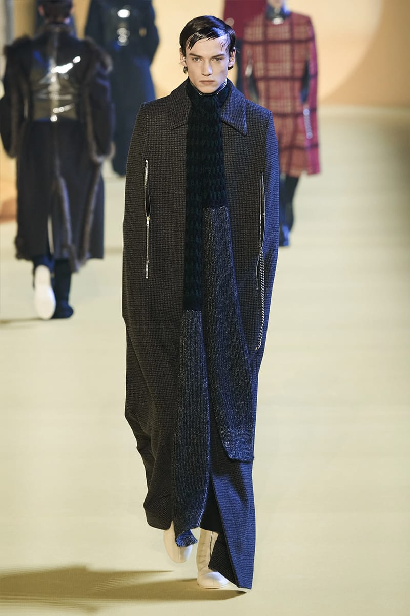 And such makes us touch on the clothing. Elegance, sophistication gripped by sci-fi poignancy were plentiful. Glimmery-vibed detailing decked propositions, featuring futuristic neck-base layering in silver, so chromatically-blatant yet so excellently executed. Imposing a sense of edge and structure were the parade of military-style coats, set against the tubular-structured knits and paired with sumptuous footwear offerings. Back to school (with the blazers) and collegiate jackets were a further go-to, aided by a yet so powerful pulse of fine cuts that adorned the full collection. On the Simons index of wearability (theoretically speaking), every tailored piece was made for a man whose life could tailor on earth. But this showed us something. Almost like an unresolved enigma: the ending felt quite imperceptible, so where do we take-off from here?” – FY Magazine.es