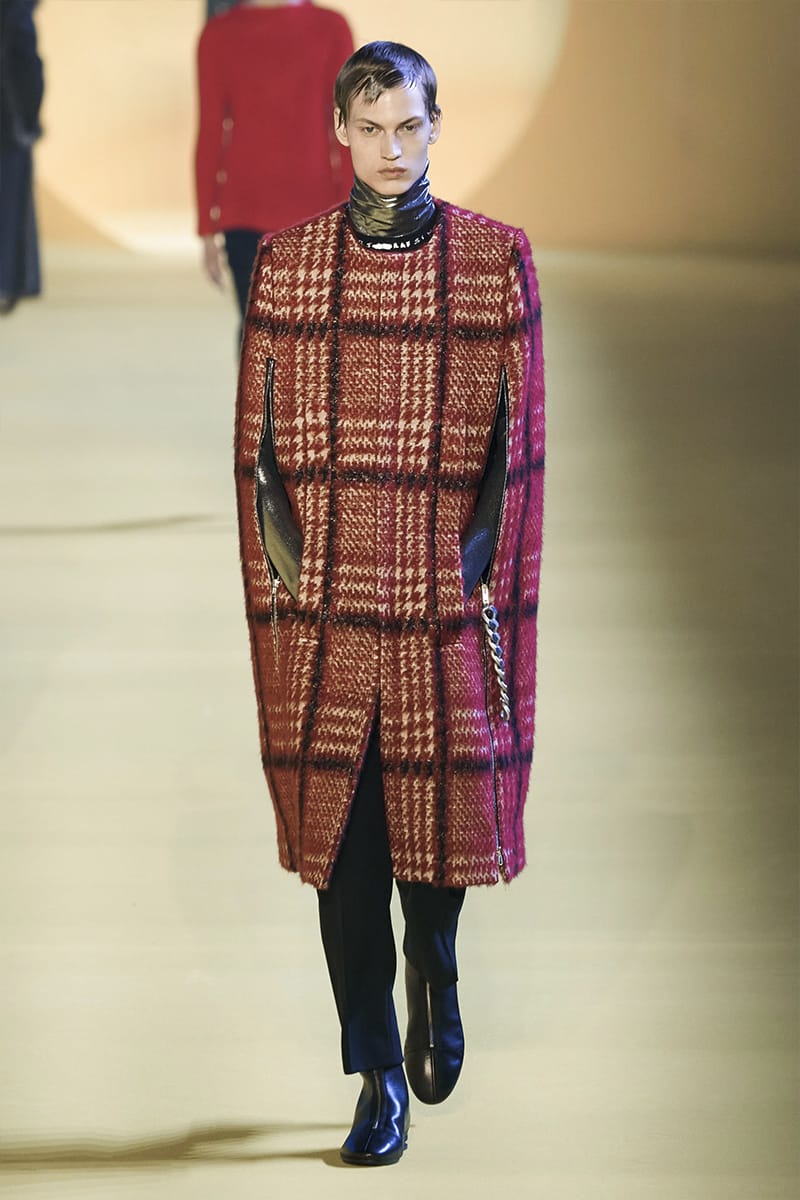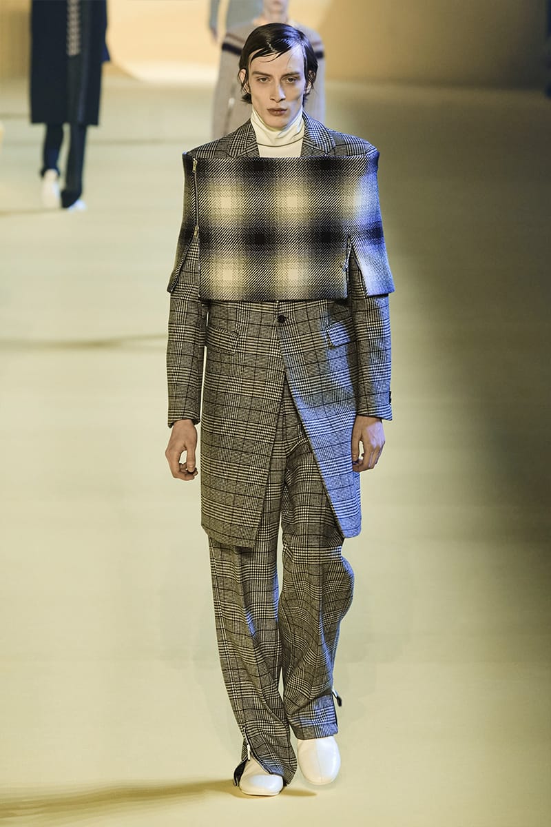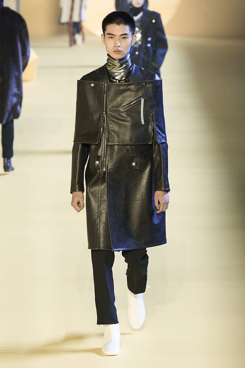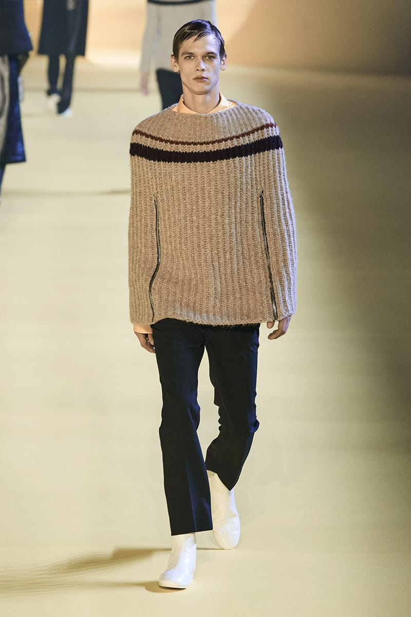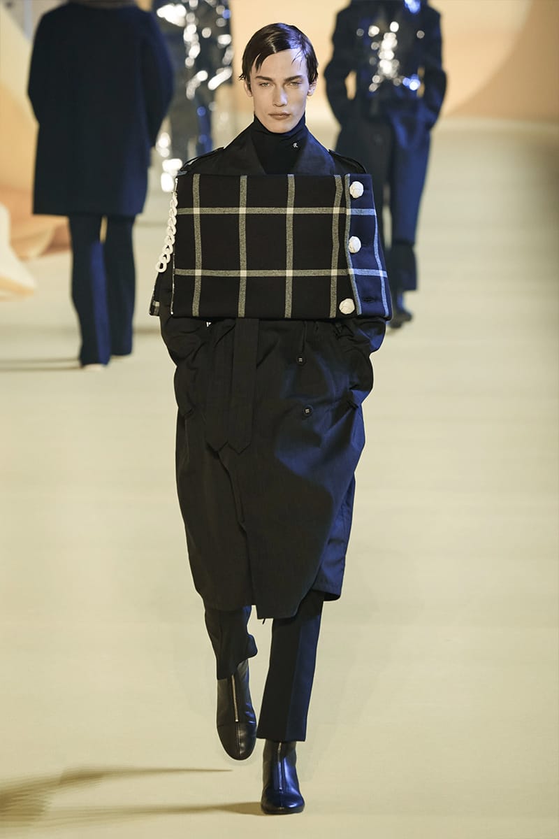 And such makes us touch on the clothing. Elegance, sophistication gripped by sci-fi poignancy were plentiful. Glimmery-vibed detailing decked propositions, featuring futuristic neck-base layering in silver, so chromatically-blatant yet so excellently executed. Imposing a sense of edge and structure were the parade of military-style coats, set against the tubular-structured knits and paired with sumptuous footwear offerings. Back to school (with the blazers) and collegiate jackets were a further go-to, aided by a yet so powerful pulse of fine cuts that adorned the full collection. On the Simons index of wearability (theoretically speaking), every tailored piece was made for a man whose life could tailor on earth. But this showed us something. Almost like an unresolved enigma: the ending felt quite imperceptible, so where do we take-off from here?” – FY Magazine.es