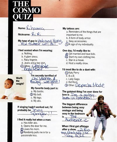 Check out her fill-ins in Cosmopolitan’s famous quizzes section. Their quite silly. On one answer, Rihanna replies to the question, “My type of guys is: Hot and hung, but sweet will do”. Or when asked, “Whats the difference between being sexy onstage and being sexy in the bedroom”, she replies, ‘The audience :)’.