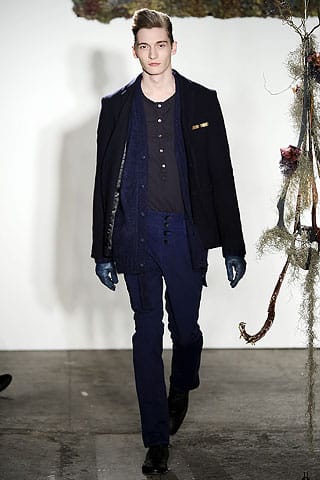 ‘This season’s man was a pallid fellow looking dashing circa 1900. But it wasn’t a festering lot of period costume, rather it was version of dark dressing made appropriate for the contemporary Count through the inclusion of leather trousers and accessories and the use of layering of simply cut separates.’