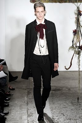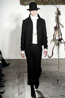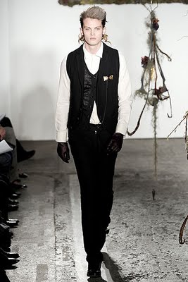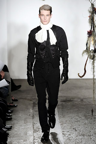 Hats are a little bit Pilgrimish but the neckwear in sharp-white, blood red, and black, completes the outfit. ‘These accessories are more affectionately known as “draped dangly bits” by one Tim Blanks.’