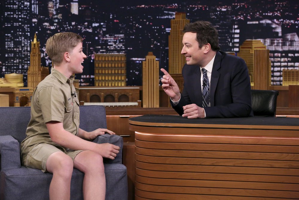 Australian cutie patootie and one of our preferred teenie bopper heartthrobs, Robert Irwin, thee son of Crocodile legend Hunter Steve Irwin, brings his humbly refreshing sunnyside up aura to The Tonight Show Starring Jimmy Fallon. Jimmy shakes rattles and rolls as he engages and handles animals including a herd of baby African pygmy goats and a Kookaburra animal that makes noises like Cardi B! The Irwin legacy shall live on with Robbie and sister Bindy carrying the torch. Catch all of Rob’s charismatic mellow-yellow kind eyes right below!