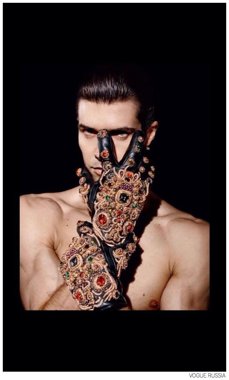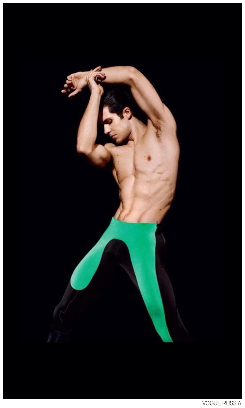 “Roberto Bolle the Superhero. After approaching the modern idea of a superhero with HENRIKSILVIUS’ spring/summer 2015 campaign, we take a step back into fall with ballet dancer Roberto Bolle gracing the pages of Vogue Russia’s September 2014 issue. The Italian dancer lends his graceful movements to the magazine for an experimental shoot lensed by photographer Daniel Sannwald. Striking bold poses, Bolle wears fashions from Christopher Kane, Dolce & Gabbana and more. An interesting fact to take note of is that Bolle wears the same bejeweled leather gloves from Dolce & Gabbana that he wore to this year’s Met Gala'” – The Fashionisto