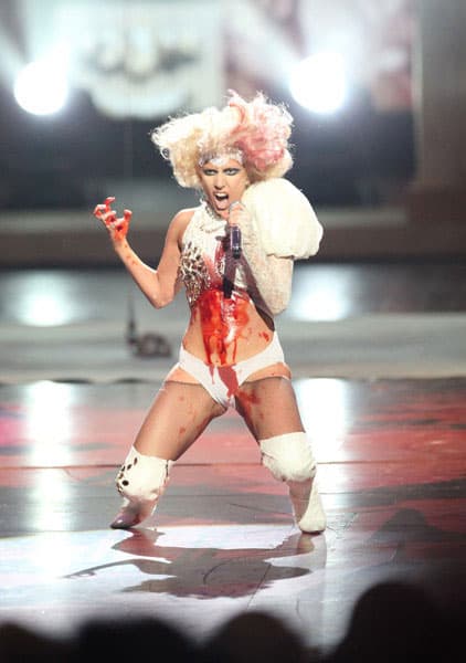 ‘Lady Gaga is a unique performance artist. And if you believe that every foray she makes into the public eye is not a calculated, pre-planned step designed to stir the public into some sort of frenzy, then you may be one rib-eye short of a full order of surf n’ turf. On such an evening as the Vma’s, it seems fit to include a half-dozen costume changes. It also would’ve had to include a performance so maddening that it would’ve felt incomplete without stage carnage of some sort.’