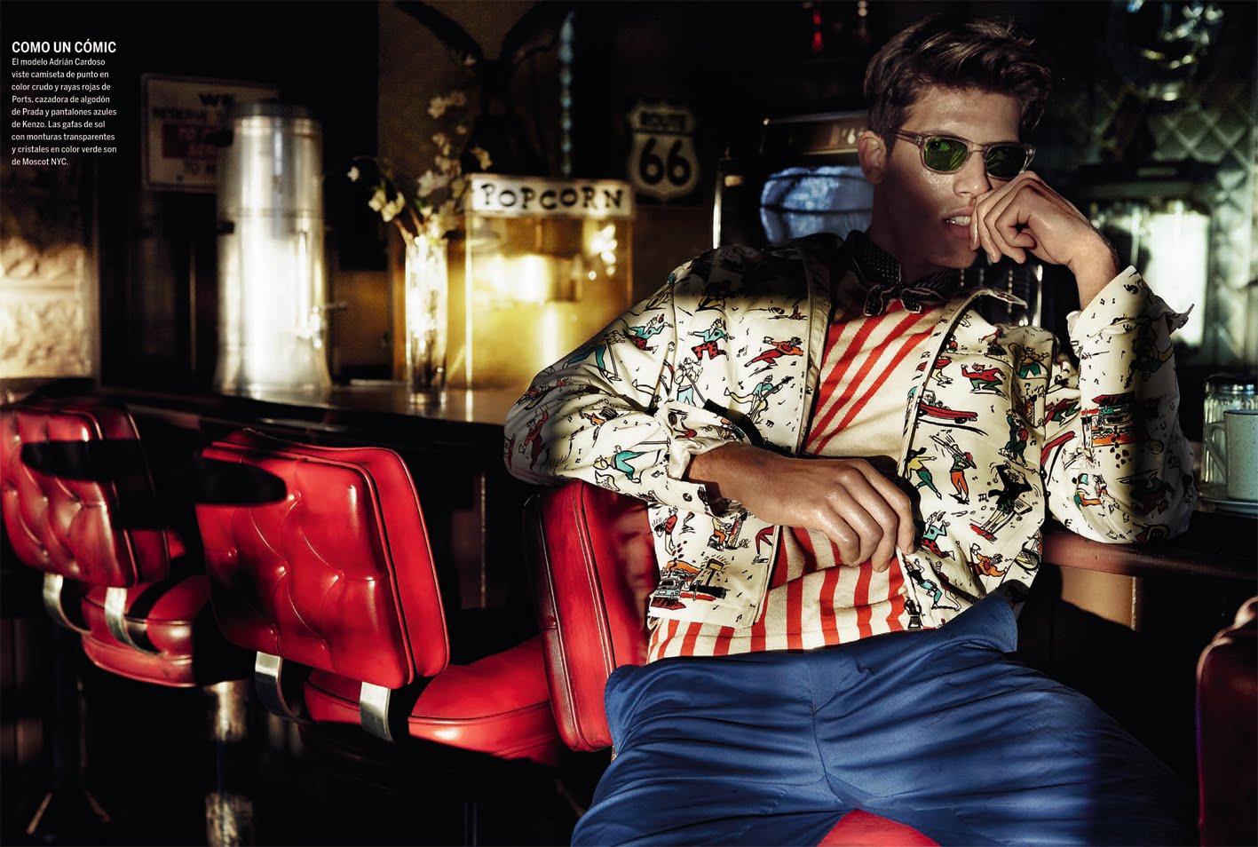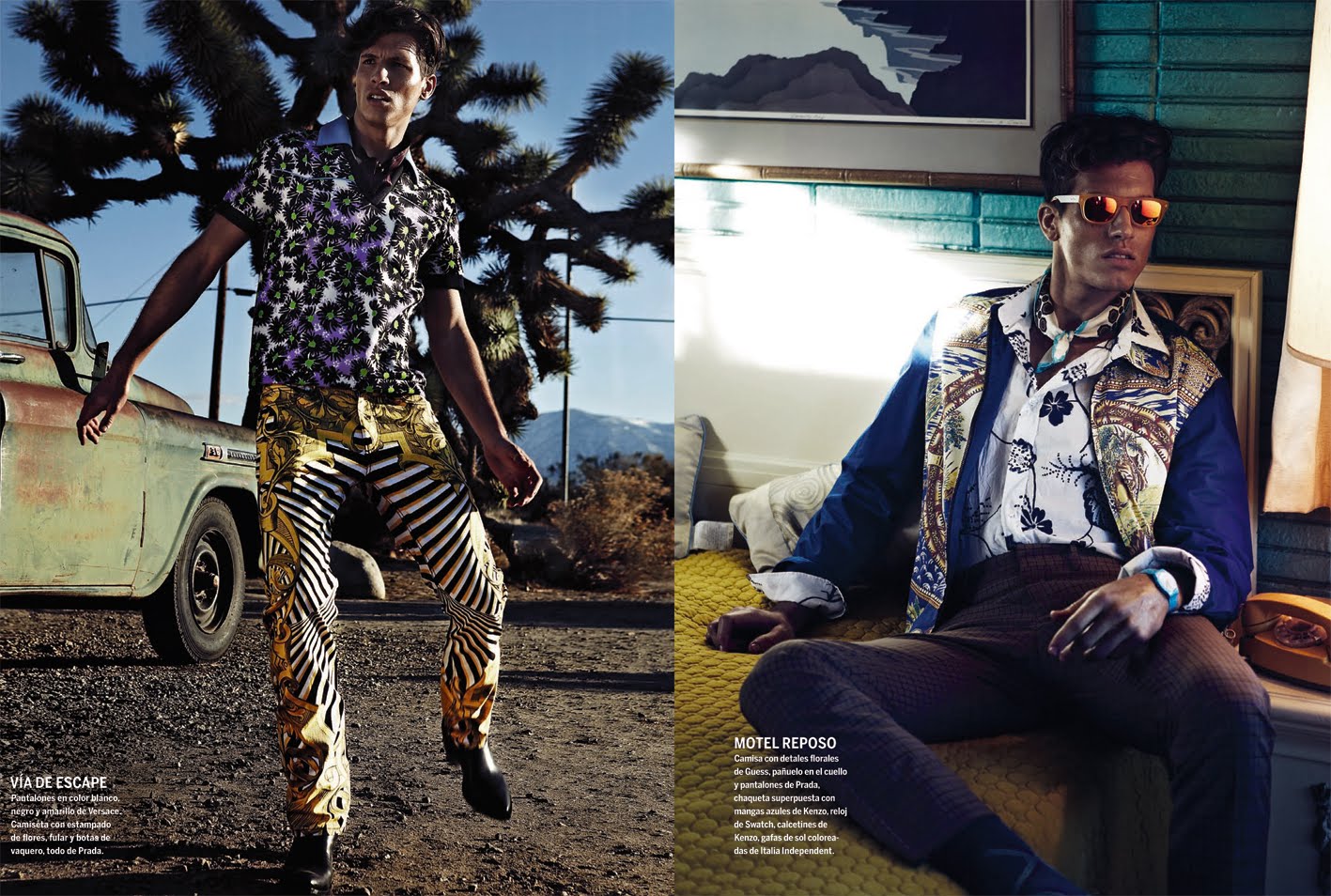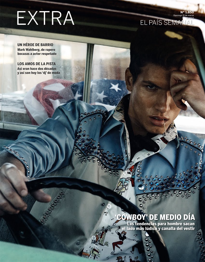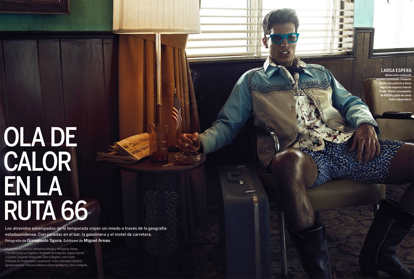 Giampaolo Sgura and Miguel Arnau create more magic together for Spain’s El Pais. The duo taps Aruba’s Adrian Cardoso to don cowboy inspired wears from the Spring/Summer 2012 collections of top designers like Miuccia Prada to Kenzo . The shoot took place on the West Coast in the dusty and windy stretch of road known to many a cross-country drive trippers as Route 66, that stretches over 2,000 miles. Courtesy of – Homotography
