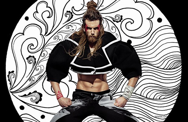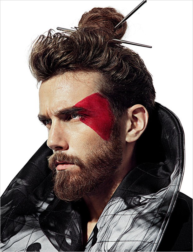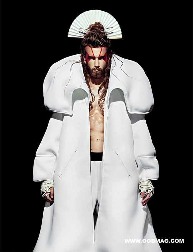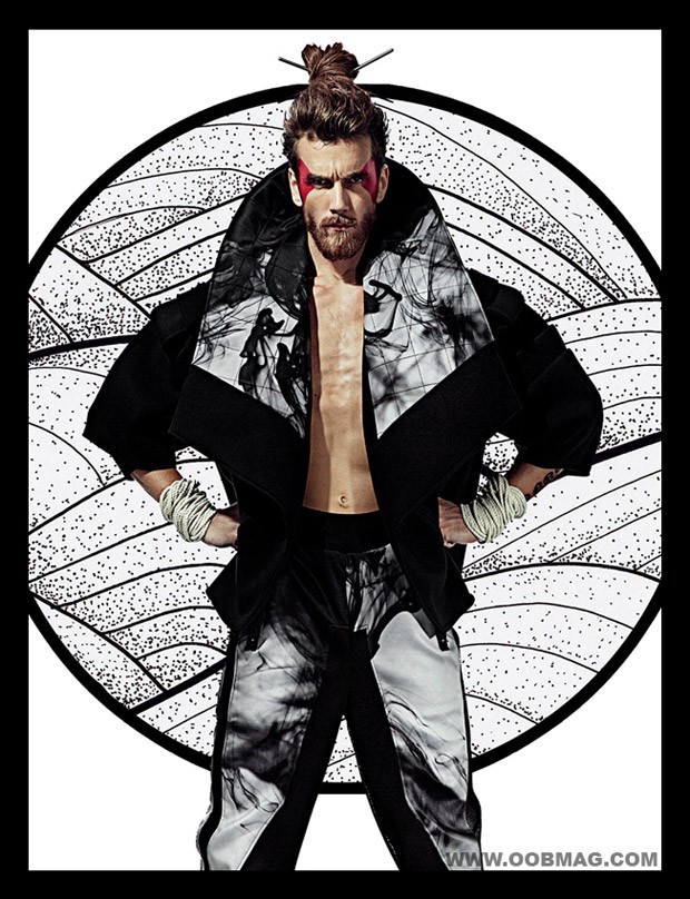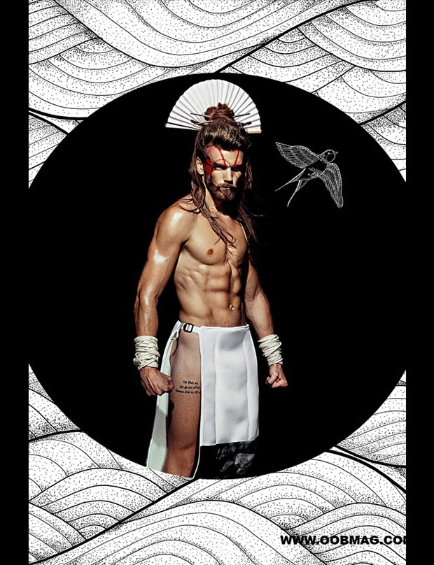 “Rune Kjelseth at WU Models stars in Way Of The Warrior story captured and styled by fashion photographer Carlos Khu for OOB Magazine‘s latest edition. Hair and makeup courtesy of Shawn Goh. Fashion editor and coord Jesus Rios, illustrations HappyPass by Septemberkhu. For the session Rune is wearing pieces from ‘DISTURBED’ Nabil Volkers Fall Winter 2015 collection.” – Malemodelscene.net