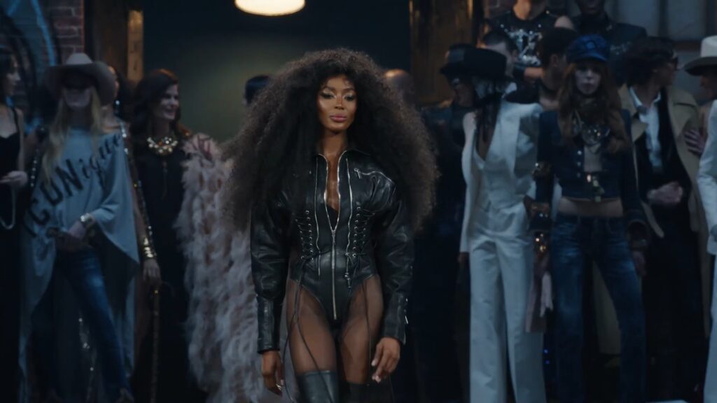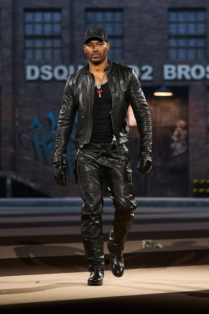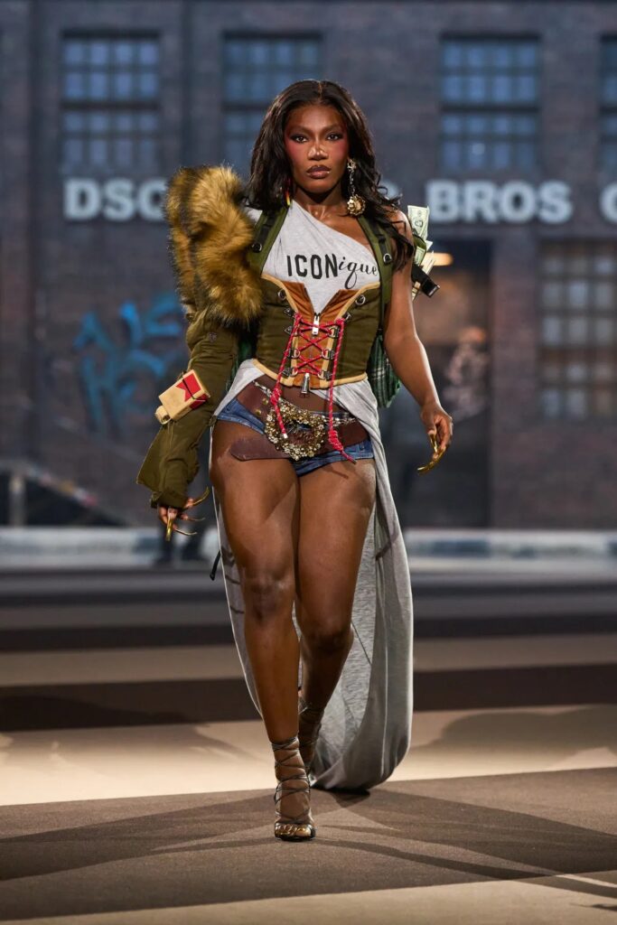 The show began dramatically with rapper Doechii emerging from a cash-filled armored vehicle. The event concluded with a stunning appearance by Naomi Campbell, who elegantly modeled a striking leather biker bodysuit, perfectly embodying the brand’s edgy style. Founded by Canadian twins Dean and Dan Caten, Dsquared2 is celebrated for its bold designs using denim and flannel, often considered among the most captivating in fashion. Their Instagram perfectly summarizes their brand: “Born in Canada, Made in Italy,” reflecting the unique blend of influences in their creations.