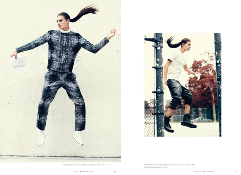 “Fresh into his career as a VNY model and exploring his editorial side, Russell Giardina appears in Blend’s new issue photographed by Paul Scala. Styled as a fashion-forward urbanite by Sonny Groo, Russell gets a striking new look courtesy of a long ponytail.” -Fashionisto