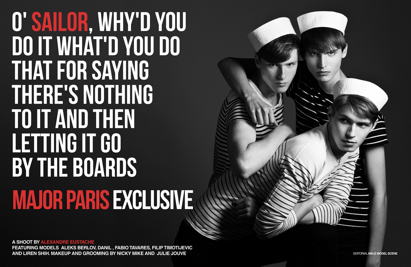 “Sailors story captured with MAJOR MODELS PARIS up and comers exclusively for Male Model Scene by photographer Alexandre Eustache. Stars of the session are Aleks Berlov, Danil, Fabio Tavares, Filip Timotijevic and Liren Shih.