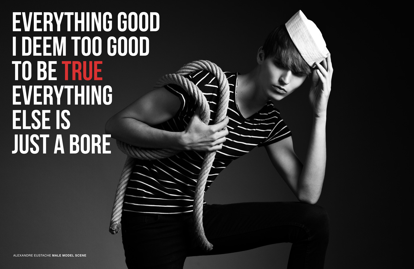 Makeup and hair styling courtesy of Nicky Mike and Julie Jouve. While Alex and the team were inspired by Jean Paul Gaultier, we were inspired for the layout design by Fiona Apple’s O’ Sailor.” – Malemodelscene.net